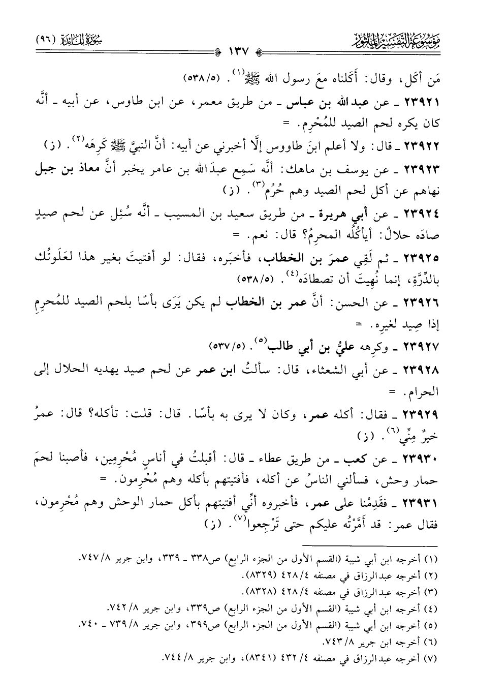 ٢٣٩٣١ - فقَدِمْنا على عمر، فأخبروه أنِّي أفتيتهم بأكل حمار الوحش وهم مُحْرِمون، فقال عمر: قد أمَّرْتُه عليكم حتى تَرْجِعوا (¬٧). (ز)