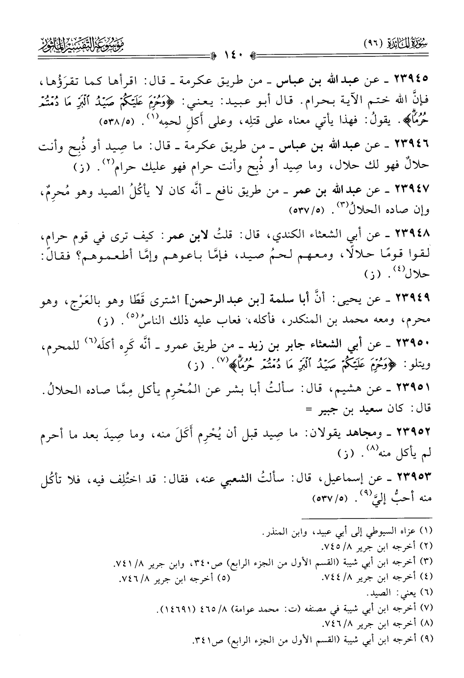 ٢٣٩٥٠ - عن أبي الشعثاء جابر بن زيد -من طريق عمرو-: أنّه كَرِه أكلَه (¬٦) للمحرم، ويتلو: {وحُرِّمَ عَلَيْكُمْ صَيْدُ البَرِّ ما دُمْتُمْ حُرُمًا} (¬٧). (ز)