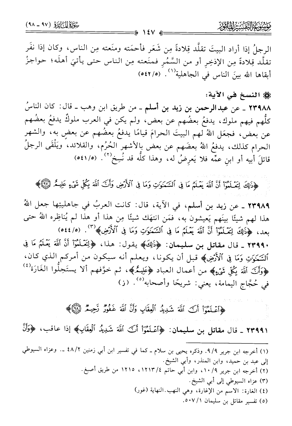 ٢٣٩٨٨ - عن عبد الرحمن بن زيد بن أسلم -من طريق ابن وهب- قال: كان الناسُ كلُّهم فيهم ملوك، يدفعُ بعضُهم عن بعض، ولم يكن في العرب ملوكٌ يدفعُ بعضُهم عن بعض، فجعَل اللهُ لهم البيتَ الحرامَ قيامًا يدفعُ بعضُهم عن بعضٍ به، والشهر الحرام كذلك، يدفعُ اللهُ بعضَهم عن بعض بالأشهر الحُرُم، والقلائد، ويَلْقى الرجلُ قاتلَ أبيه أو ابنِ عمِّه فلا يَعرِضُ له، وهذا كلُّه قد نُسِخ (¬٢). (٥/ ٥٤١)