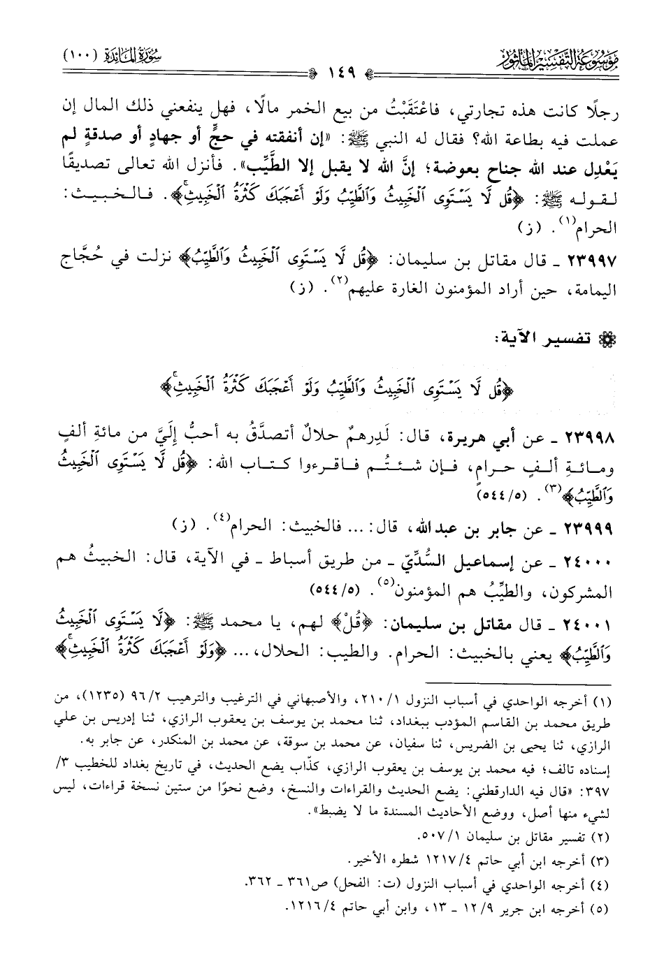 رجلًا كانت هذه تجارتي، فاعْتَقَبْتُ من بيع الخمر مالًا، فهل ينفعني ذلك المال إن عملت فيه بطاعة الله؟ فقال له النبي - صلى الله عليه وسلم -: «إن أنفقته في حجٍّ أو جهادٍ أو صدقةٍ لم يَعْدِل عند الله جناح بعوضة؛ إنّ الله لا يقبل إلا الطَّيِّب». فأنزل الله تعالى تصديقًا لقوله - صلى الله عليه وسلم -: {قل لا يستوي الخبيث والطيب ولو أعجبك كثرة الخبيث}. فالخبيث: الحرام (¬١). (ز)