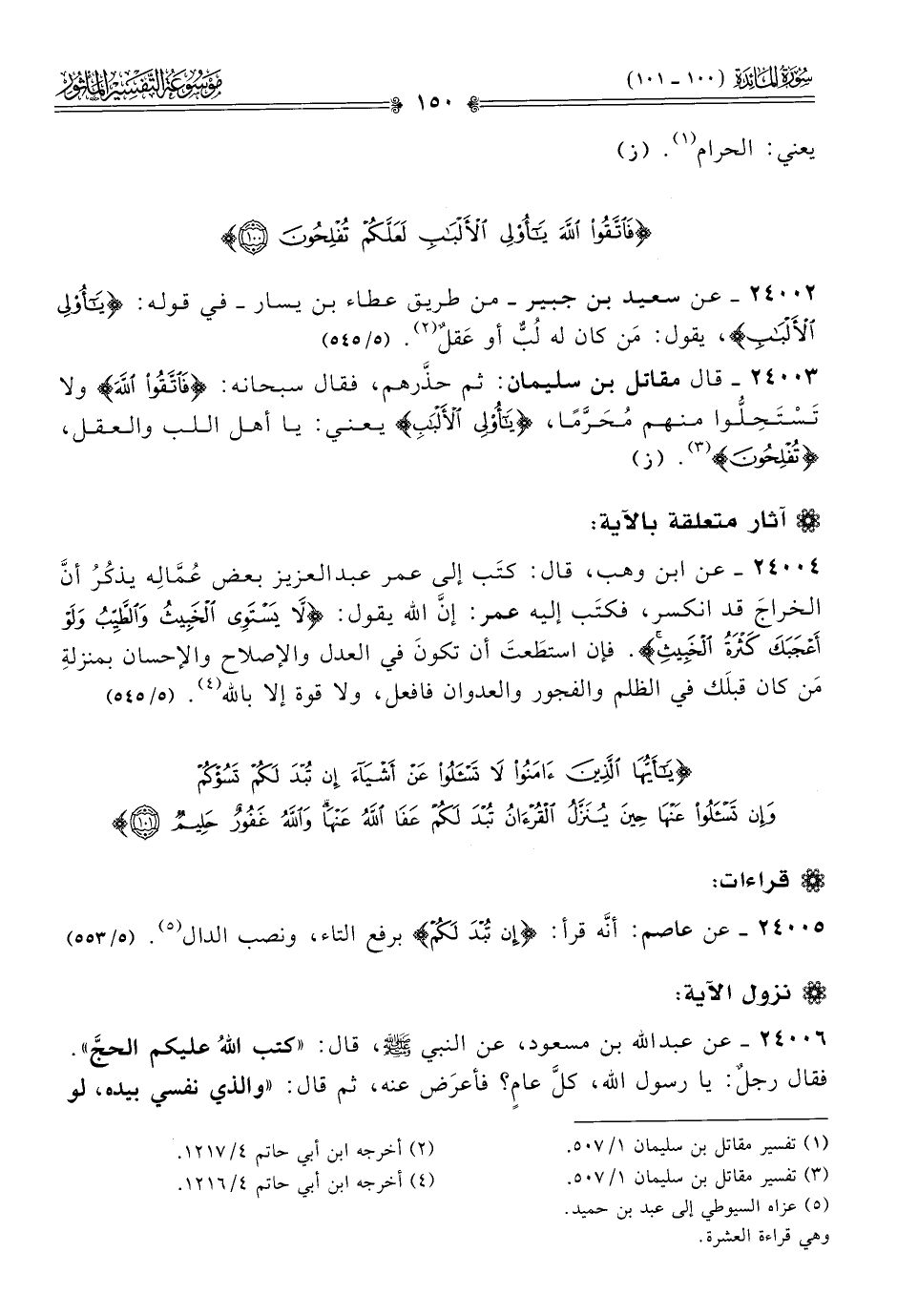 ٢٤٠٠٣ - قال مقاتل بن سليمان: ثم حذَّرهم، فقال سبحانه: {فاتَّقُوا اللَّهَ} ولا تَسْتَحِلُّوا منهم مُحَرَّمًا، {يا أُولِي الأَلْبابِ} يعني: يا أهل اللب والعقل، {لَعَلَّكُمْ تُفْلِحُونَ} (¬٣). (ز)