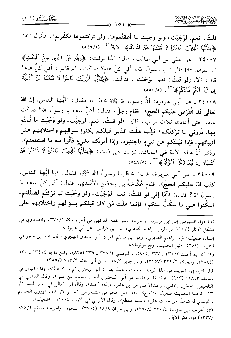 ٢٤٠٠٧ - عن علي بن أبي طالب، قال: لَمّا نزلت: {ولله على الناس حج البيت} قالوا: يا رسول الله، أفي كلِّ عامٍ؟ فسكَتَ، ثم قالوا: أفي كلِّ عامٍ؟ قال: «لا، ولو قلتُ: نعم. لوَجَبَت». فنزلت: {يا أيها الذين آمنوا لا تسألوا عن أشياء إن تبد لكم تسؤكم} (¬٢). (٥/ ٥٥٠)