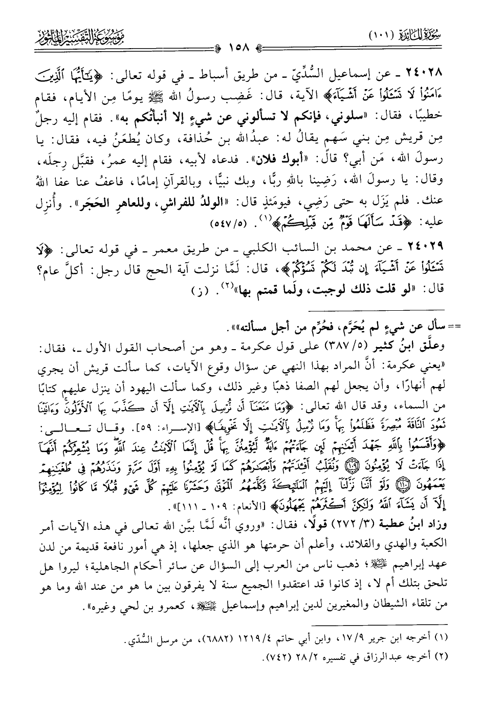 ٢٤٠٢٨ - عن إسماعيل السدي -من طريق أسباط- في قوله تعالى: {يا أيها الذين آمنوا لا تسألوا عن أشياء} الآية، قال: غَضِب رسول الله - صلى الله عليه وسلم - يومًا مِن الأيام، فقام خطيبًا، فقال: «سلوني، فإنكم لا تسألوني عن شيءٍ إلا أنبأتُكم به». فقام إليه رجلٌ مِن قريش مِن بني سَهمٍ يقالُ له: عبدُ الله بن حُذافة، وكان يُطعَنُ فيه، فقال: يا رسول الله، مَن أبي؟ قال: «أبوك فلان». فدعاه لأبيه، فقام إليه عمرُ، فقبَّل رِجلَه، وقال: يا رسول الله، رَضِينا باللهِ ربًّا، وبك نبيا، وبالقرآنِ إمامًا، فاعفُ عنا عفا اللهُ عنك. فلم يَزَل به حتى رَضِي، فيومَئذٍ قال: «الولدُ للفراشِ، وللعاهرِ الحَجَر». وأُنزِل عليه: {قد سألها قوم من قبلكم} (¬١). (٥/ ٥٤٧)