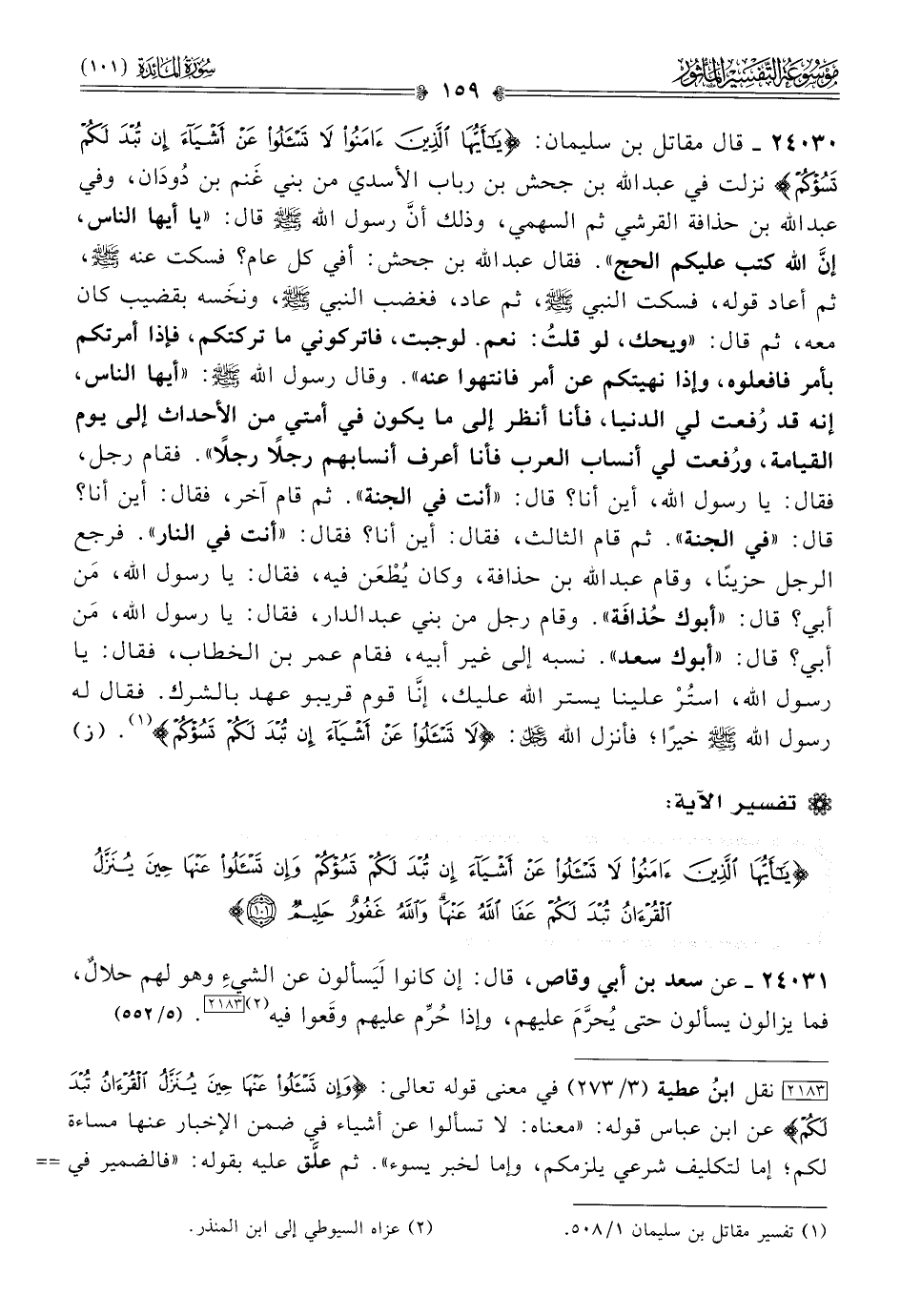 ٢٤٠٣٠ - قال مقاتل بن سليمان: {يا أيُّها الَّذِينَ آمَنُوا لا تَسْئَلُوا عَنْ أشْياءَ إنْ تُبْدَ لَكُمْ تَسُؤْكُمْ} نزلت في عبد الله بن جحش بن رباب الأسدي من بني غَنم بن دُودان، وفي عبد الله بن حذافة القرشي ثم السهمي، وذلك أنّ رسول الله - صلى الله عليه وسلم - قال: «يا أيها الناس، إنّ الله كتب عليكم الحج». فقال عبد الله بن جحش: أفي كل عام؟ فسكت عنه - صلى الله عليه وسلم -، ثم أعاد قوله، فسكت النبي - صلى الله عليه وسلم -، ثم عاد، فغضب النبي - صلى الله عليه وسلم -، ونخَسه بقضيب كان معه، ثم قال: «ويحك، لو قلتُ: نعم. لوجبت، فاتركوني ما تركتكم، فإذا أمرتكم بأمر فافعلوه، وإذا نهيتكم عن أمر فانتهوا عنه». وقال رسول الله - صلى الله عليه وسلم -: «أيها الناس، إنه قد رُفعت لي الدنيا، فأنا أنظر إلى ما يكون في أمتي من الأحداث إلى يوم القيامة، ورُفعت لي أنساب العرب فأنا أعرف أنسابهم رجلًا رجلًا». فقام رجل، فقال: يا رسول الله، أين أنا؟ قال: «أنت في الجنة». ثم قام آخر، فقال: أين أنا؟ قال: «في الجنة». ثم قام الثالث، فقال: أين أنا؟ فقال: «أنت في النار». فرجع الرجل حزينًا، وقام عبد الله بن حذافة، وكان يُطْعَن فيه، فقال: يا رسول الله، مَن أبي؟ قال: «أبوك حُذافَة». وقام رجل من بني عبد الدار، فقال: يا رسول الله، مَن أبي؟ قال: «أبوك سعد». نسبه إلى غير أبيه، فقام عمر بن الخطاب، فقال: يا رسول الله، استُرْ علينا يستر الله عليك، إنّا قوم قريبو عهد بالشرك. فقال له رسول الله - صلى الله عليه وسلم - خيرًا؛ فأنزل الله - عز وجل -: {لا تَسْئَلُوا عَنْ أشْياءَ إنْ تُبْدَ لَكُمْ تَسُؤْكُمْ} (¬١). (ز)