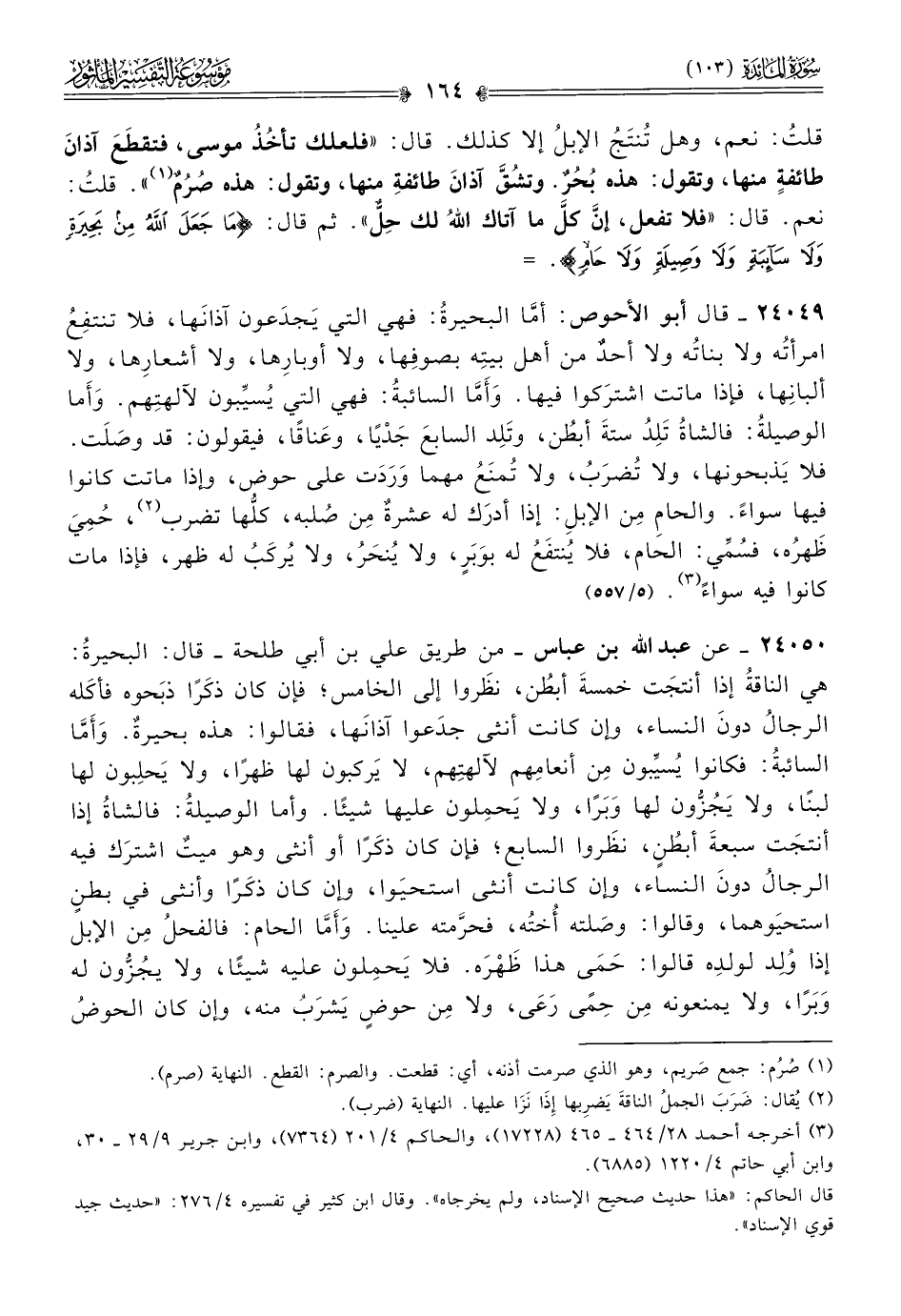 ٢٤٠٥٠ - عن عبد الله بن عباس -من طريق علي بن أبي طلحة- قال: البحيرةُ: هي الناقةُ إذا أنتجَت خمسةَ أبطُن، نظَروا إلى الخامس؛ فإن كان ذكَرًا ذبَحوه فأكَله الرجالُ دونَ النساء، وإن كانت أنثى جدَعوا آذانَها، فقالوا: هذه بحيرةٌ. وأَمّا السائبةُ: فكانوا يُسيِّبون مِن أنعامِهم لآلهتِهم، لا يَركبون لها ظهرًا، ولا يَحلِبون لها لبنًا، ولا يَجُزُّون لها وبَرًا، ولا يَحمِلون عليها شيئًا. وأما الوصيلةُ: فالشاةُ إذا أنتجَت سبعةَ أبطُنٍ، نظَروا السابع؛ فإن كان ذكَرًا أو أنثى وهو ميتٌ اشترَك فيه الرجالُ دونَ النساء، وإن كانت أنثى استحيَوا، وإن كان ذكَرًا وأنثى في بطنٍ استحيَوهما، وقالوا: وصَلته أُختُه، فحرَّمته علينا. وأَمّا الحام: فالفحلُ مِن الإبل إذا وُلِد لولدِه قالوا: حَمى هذا ظَهْرَه. فلا يَحمِلون عليه شيئًا، ولا يجُزُّون له وبَرًا، ولا يمنعونه مِن حِمًى رَعى، ولا مِن حوضٍ يَشرَبُ منه، وإن كان الحوضُ