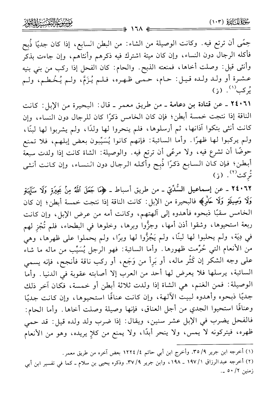 ٢٤٠٦٢ - عن إسماعيل السُّدِّيّ -من طريق أسباط- {ما جعل الله من بحيرة ولا سائبة ولا وصيلة ولا حام} فالبحيرة من الإبل: كانت الناقة إذا نتجت خمسة أبطن؛ إن كان الخامس سقبًا ذبحوه فأهدوه إلى آلهتهم، وكانت أمه من عرض الإبل، وإن كانت ربعة استحيوها، وشقوا أذن أمها، وجزُّوا وبرها، وخلوها في البطحاء، فلم تُجْزِ لهم في دِيَة، ولم يحلبوا لها لبنًا، ولم يَجُزُّوا لها وبرًا، ولم يحملوا على ظهرها، وهي من الأنعام التي حُرِّمت ظهورها. وأما السائبة: فهو الرجل يُسَيِّب من ماله ما شاء على وجه الشكر إن كَثُر ماله، أو بَرِأ من وجَع، أو ركب ناقة فأنجح، فإنه يسمي السائبة، يرسلها فلا يعرض لها أحد من العرب إلا أصابته عقوبة في الدنيا. وأما الوصيلة: فمن الغنم، هي الشاة إذا ولدت ثلاثة أبطن أو خمسة، فكان آخر ذلك جديًا ذبحوه وأهدوه لبيت الآلهة، وإن كانت عناقًا استحيوها، وإن كانت جديًا وعناقًا استحيوا الجدي من أجل العناق، فإنها وصيلة وصلت أخاها. وأما الحام: فالفحل يضرب في الإبل عشر سنين، ويقال: إذا ضرب ولد ولده قيل: قد حمي ظهره، فيتركونه لا يمس، ولا ينحر أبدًا، ولا يمنع من كلإٍ يريده، وهو من الأنعام