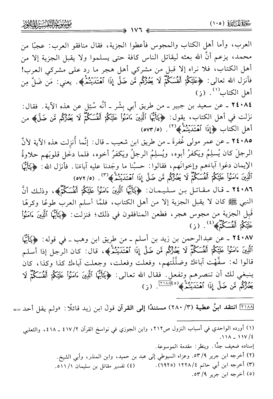 ٢٤٠٨٦ - قال مقاتل بن سليمان: {يا أيُّها الَّذِينَ آمَنُوا عَلَيْكُمْ أنْفُسَكُمْ}، وذلك أنّ النبي - صلى الله عليه وسلم - كان لا يقبل الجزية إلا من أهل الكتاب، فلمّا أسلم العرب طوعًا وكرهًا قَبِل الجزية من مجوس هجر، فطعن المنافقون في ذلك؛ فنزلت: {يا أيُّها الَّذِينَ آمَنُوا عَلَيْكُمْ أنْفُسَكُمْ} (¬٤). (ز)