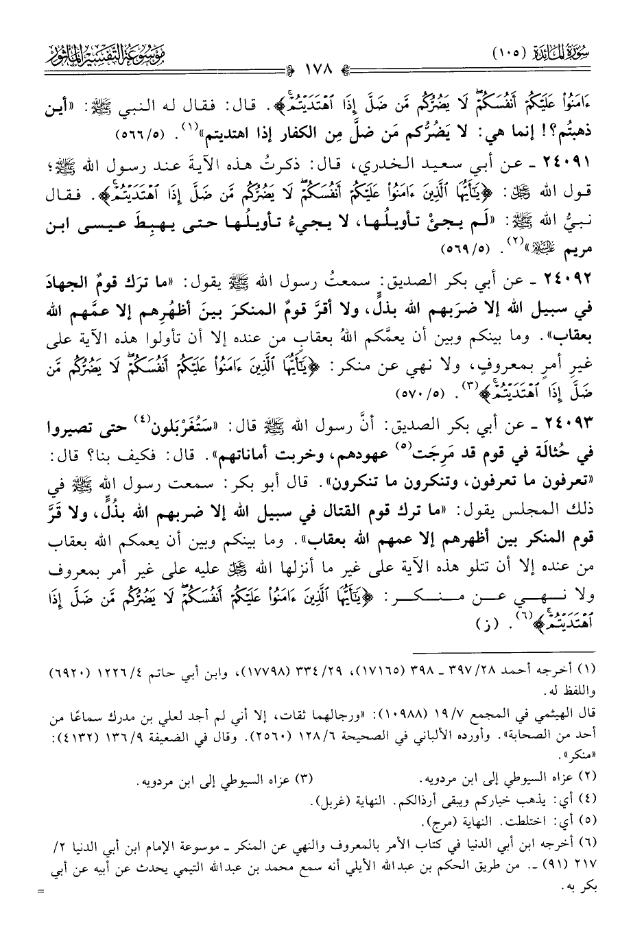 ٢٤٠٩٢ - عن أبي بكر الصديق: سمعتُ رسول الله - صلى الله عليه وسلم - يقول: «ما ترَك قومٌ الجهادَ في سبيل الله إلا ضرَبهم الله بذلٍّ، ولا أقرَّ قومٌ المنكرَ بينَ أظهُرِهم إلا عمَّهم الله بعقاب». وما بينكم وبين أن يعمَّكم اللهُ بعقابٍ من عنده إلا أن تأولوا هذه الآية على غيرِ أمرٍ بمعروفٍ، ولا نهي عن منكر: {يا أيها الذين آمنوا عليكم أنفسكم لا يضركم من ضل إذا اهتديتم} (¬٣). (٥/ ٥٧٠)