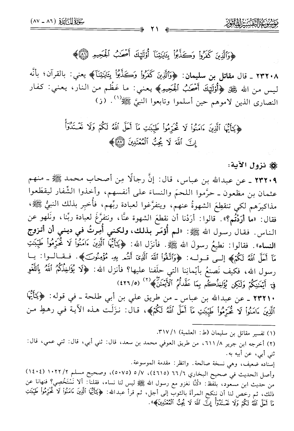 ٢٣٢١٠ - عن عبد الله بن عباس -من طريق علي بن أبي طلحة- في قوله: {يا أيها الذين آمنوا لا تحرموا طيبات ما أحل الله لكم}، قال: نزَلَت هذه الآية في رهطٍ من