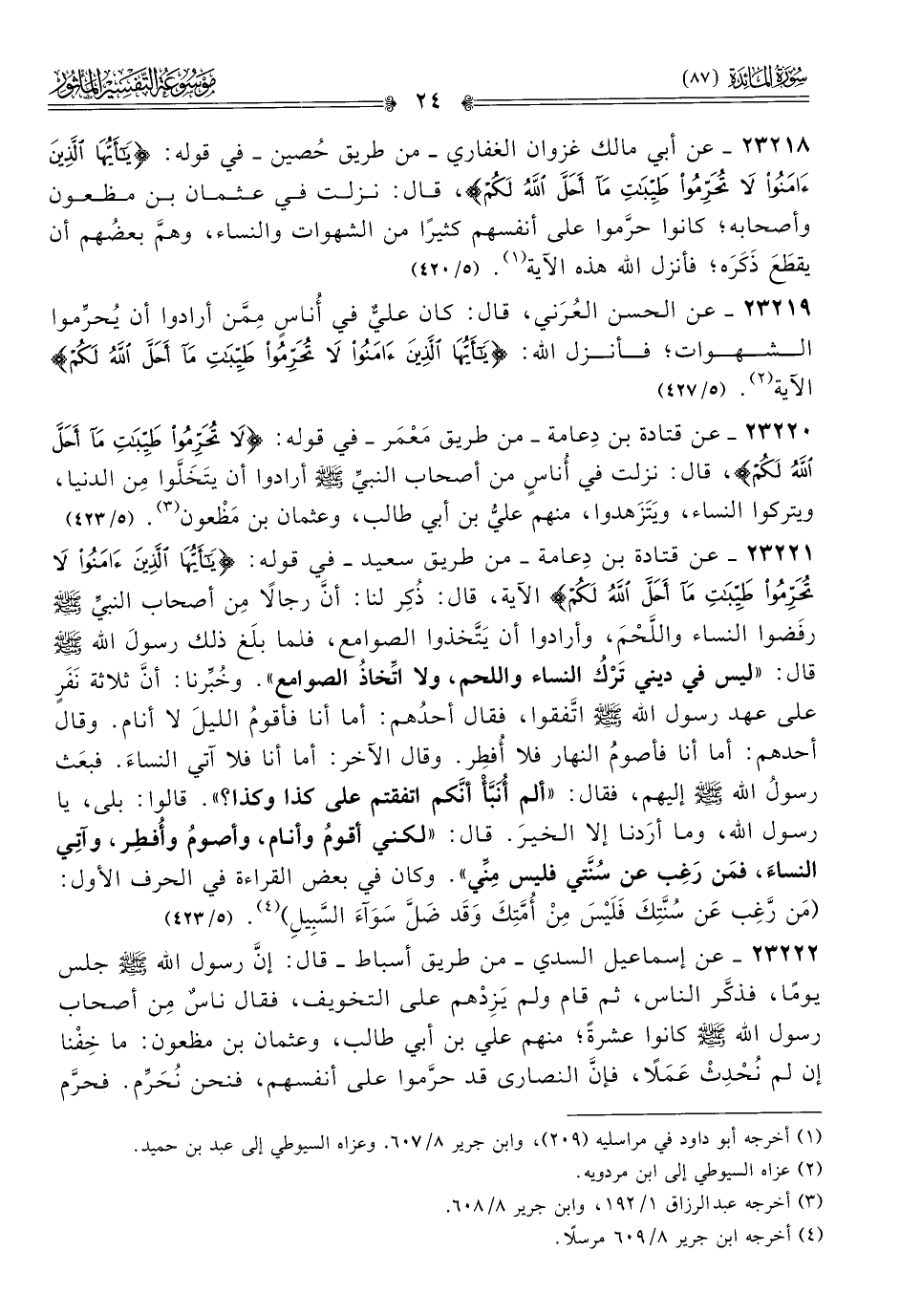 ٢٣٢٢٢ - عن إسماعيل السدي -من طريق أسباط- قال: إنّ رسول الله - صلى الله عليه وسلم - جلس يومًا، فذكَّر الناس، ثم قام ولم يَزِدْهم على التخويف، فقال ناسٌ مِن أصحاب رسول الله - صلى الله عليه وسلم - كانوا عشرةً؛ منهم علي بن أبي طالب، وعثمان بن مظعون: ما خِفْنا إن لم نُحْدِثْ عَمَلًا، فإنّ النصارى قد حرَّموا على أنفسهم، فنحن نُحَرِّم. فحرَّم