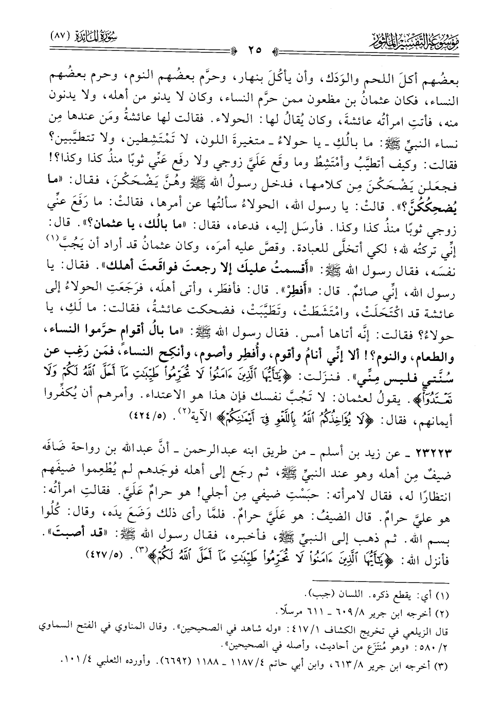 ٢٣٢٢٣ - عن زيد بن أسلم -من طريق ابنه عبد الرحمن-: أنّ عبد الله بن رواحة ضافَه ضيفٌ مِن أهله وهو عند النبي - صلى الله عليه وسلم -، ثم رجَع إلى أهله فوجَدهم لم يُطْعِموا ضيفَهم انتظارًا له، فقال لامرأته: حبَسْتِ ضيفي مِن أجلي! هو حرامٌ عَلَيَّ. فقالتِ امرأتُه: هو عليَّ حرامٌ. قال الضيفُ: هو عَلَيَّ حرامٌ. فلمّا رأى ذلك وضَعَ يدَه، وقال: كُلُوا بسم الله. ثم ذهب إلى النبي - صلى الله عليه وسلم -، فأخبره، فقال رسول الله - صلى الله عليه وسلم -: «قد أصبتَ». فأنزل الله: {يا أيها الذين آمنوا لا تحرموا طيبات ما أحل الله لكم} (¬٣). (٥/ ٤٢٧)