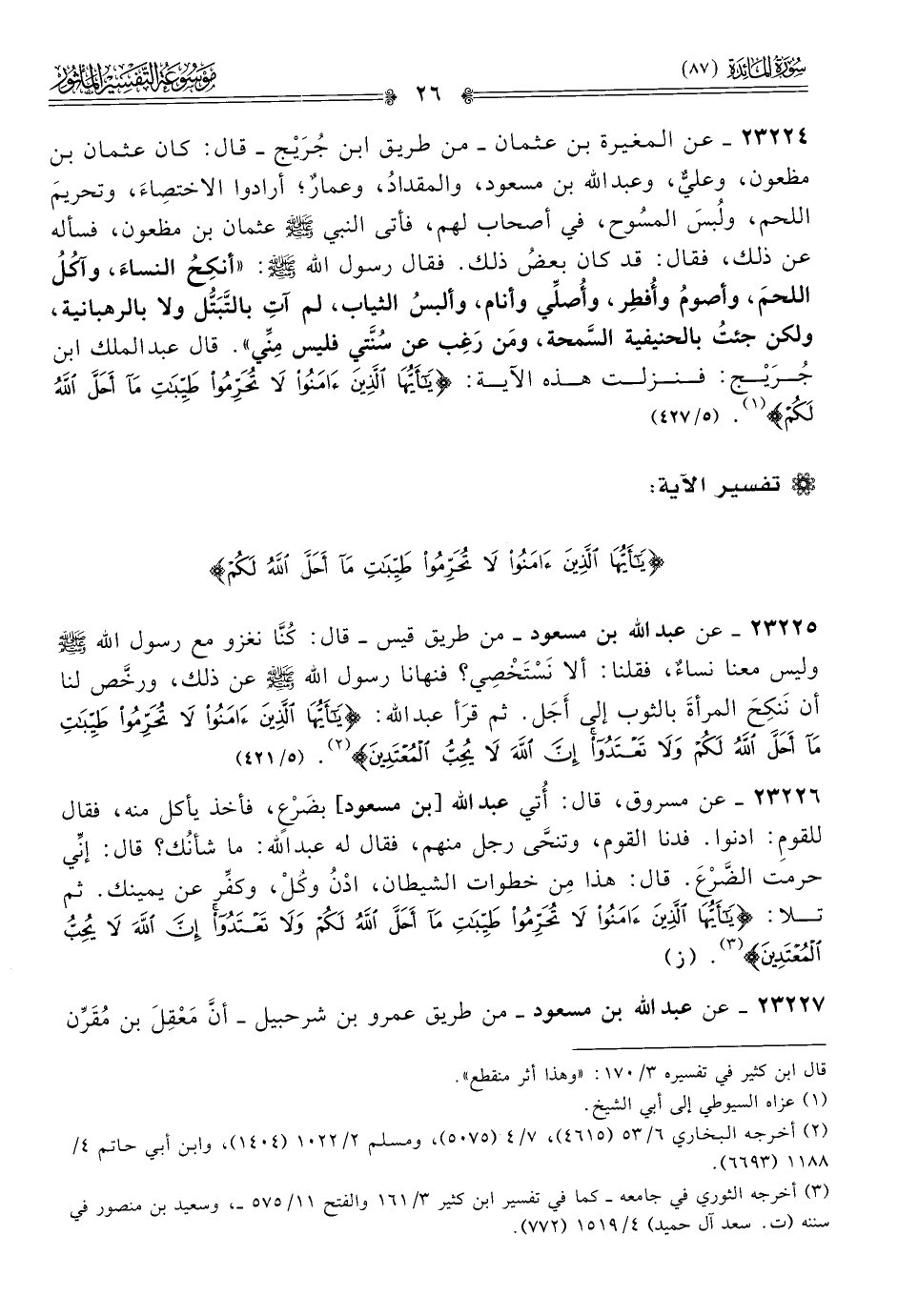 ٢٣٢٢٦ - عن مسروق، قال: أُتي عبد الله [بن مسعود] بضَرْعٍ، فأخذ يأكل منه، فقال للقومِ: ادنوا. فدنا القوم، وتنحّى رجل منهم، فقال له عبد الله: ما شأنُك؟ قال: إنِّي حرمت الضَّرْعَ. قال: هذا مِن خطوات الشيطان، ادْنُ وكُلْ، وكفِّر عن يمينك. ثم تلا: {يا أيُّها الَّذِينَ آمَنُوا لا تُحَرِّمُوا طَيِّباتِ ما أحَلَّ اللَّهُ لَكُمْ ولا تَعْتَدُوا إنَّ اللَّهَ لا يُحِبُّ المُعْتَدِينَ} (¬٣). (ز)