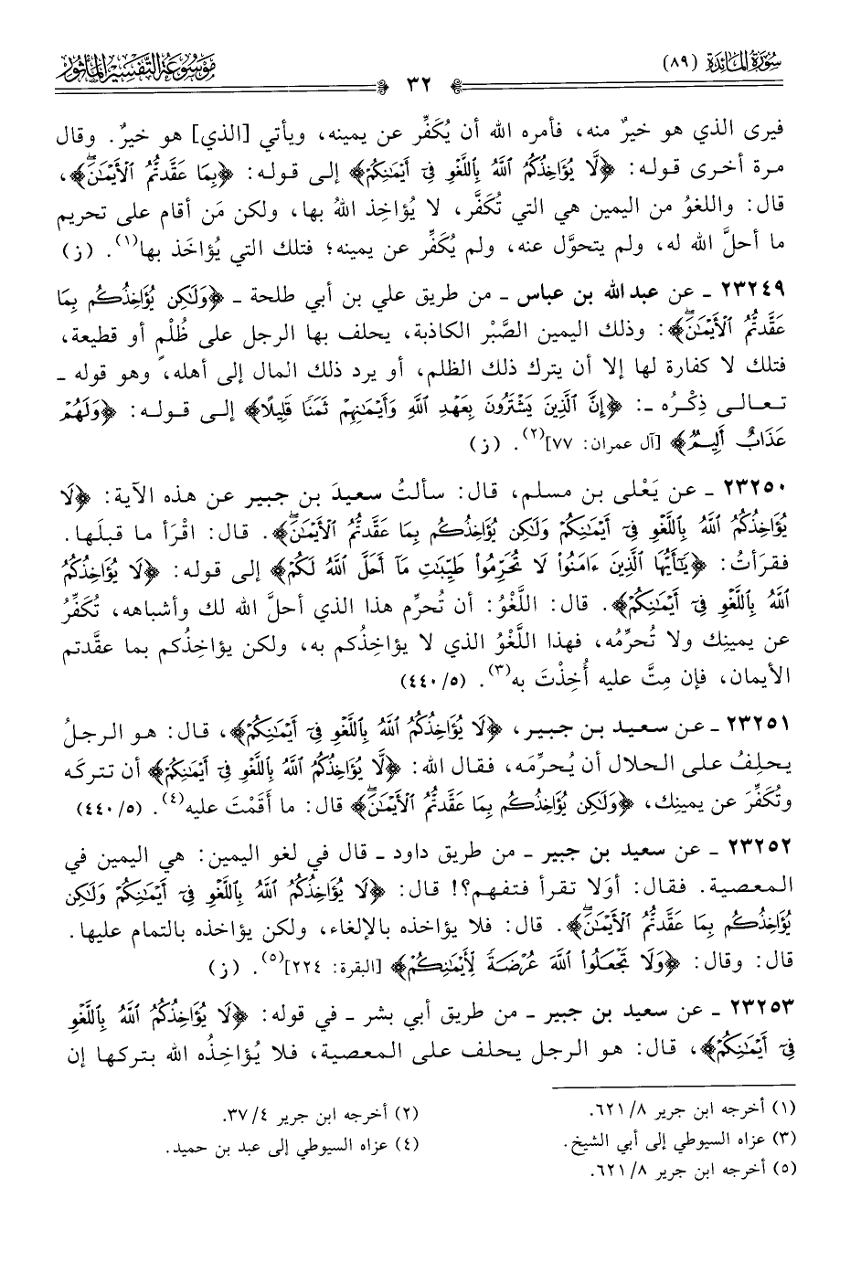 ٢٣٢٥٣ - عن سعيد بن جبير -من طريق أبي بشر- في قوله: {لا يؤاخذكم الله باللغو في أيمانكم}، قال: هو الرجل يحلف على المعصية، فلا يُؤاخِذُه الله بتركها
