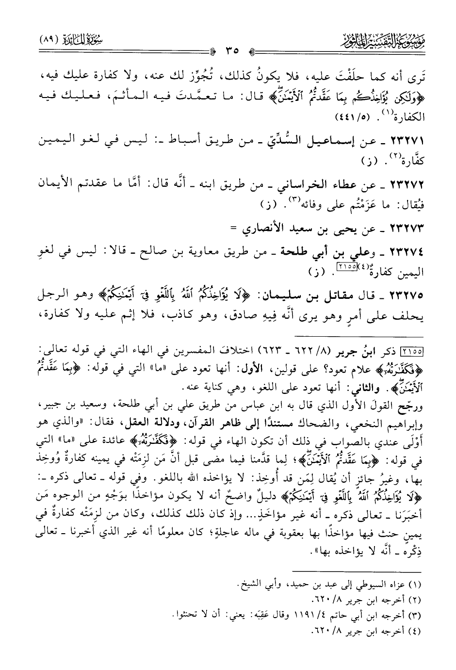 ورجّح القولَ الأول لذي قال به ابن عباس من طريق علي بن أبي طلحة، وسعيد بن جبير، وإبراهيم النخعي، والضحاك مستندًا إلى ظاهر القرآن، ودلالة العقل، فقال: «والذي هو أوْلى عندي بالصواب في ذلك أن تكون الهاء في قوله: {فَكَفّارَتُهُ} عائدة على» ما «التي في قوله: {بِما عَقَّدتُّمُ الأَيْمانَ}؛ لِما قدَّمنا فيما مضى قبل أنّ مَن لزِمَتْه في يمينه كفارةٌ وُوخِذ بها، وغيرُ جائزٍ أن يُقال لِمَن قد أُوخِذ: لا يؤاخذه الله باللغو. وفي قوله -تعالى ذكره-: {لا يُؤاخِذُكُمُ اللَّهُ بِاللَّغْوِ فِي أيْمانِكُمْ} دليلٌ واضحٌ أنه لا يكون مؤاخذًا بوَجْهٍ من الوجوه مَن أخبَرَنا -تعالى ذكره- أنه غير مؤاخَذٍ ... وإذ كان ذلك كذلك، وكان من لزِمَتْه كفارةٌ في يمينٍ حنث فيها مؤاخذًا بها بعقوبة في ماله عاجلةٍ؛ كان معلومًا أنه غير الذي أخبرنا -تعالى ذِكْره- أنّه لا يؤاخذه بها».