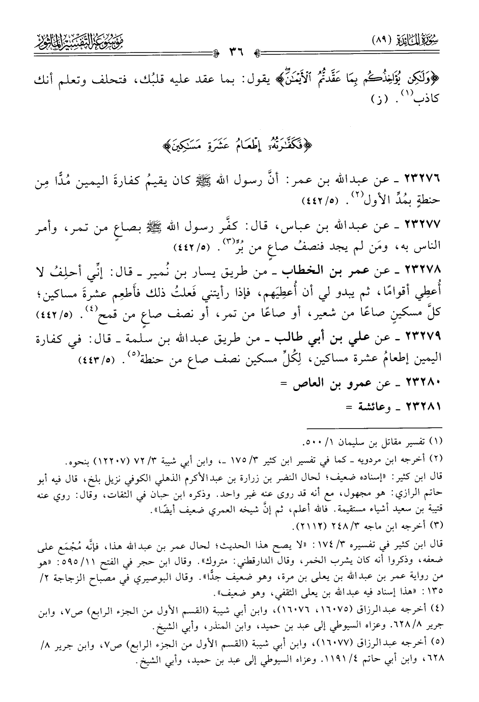 ٢٣٢٧٩ - عن علي بن أبي طالب -من طريق عبد الله بن سلمة- قال: في كفارة اليمين إطعامُ عشرة مساكين، لِكُلِّ مسكين نصف صاع من حنطة (¬٥). (٥/ ٤٤٣)