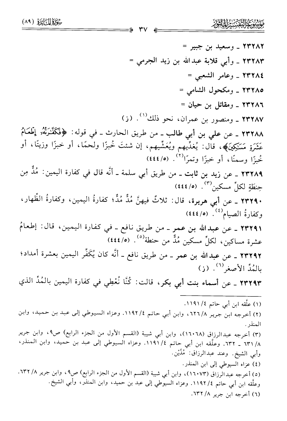 ٢٣٢٨٩ - عن زيد بن ثابت -من طريق أبي سلمة- أنّه قال في كفارة اليمين: مُدٌّ مِن حِنطَةٍ لكلِّ مسكين (¬٣). (٥/ ٤٤٤)
