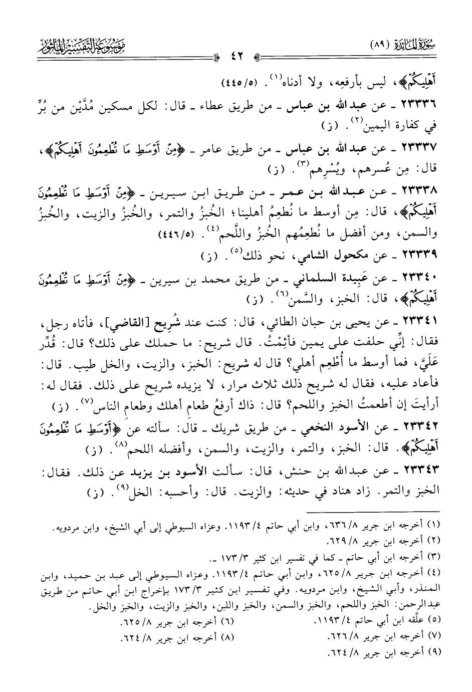 ٢٣٣٣٨ - عن عبد الله بن عمر -من طريق ابن سيرين- {من أوسط ما تطعمون أهليكم}، قال: مِن أوسط ما نُطعِمُ أهلينا؛ الخُبزُ والتمر، والخُبزُ والزيت، والخُبزُ والسمن، ومن أفضل ما نُطعِمُهم الخُبزُ واللَّحم (¬٤). (٥/ ٤٤٦)