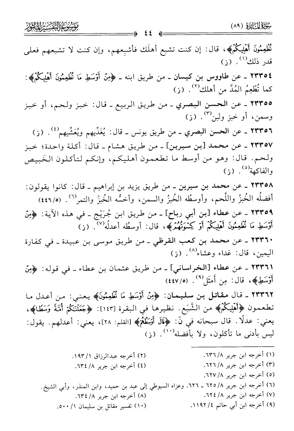 ٢٣٣٥٤ - عن طاووس بن كيسان -من طريق ابنه- {من أوسط ما تطعمون أهليكم}: كما تُطْعِمُ المُدَّ من أهلك (¬٢). (ز)