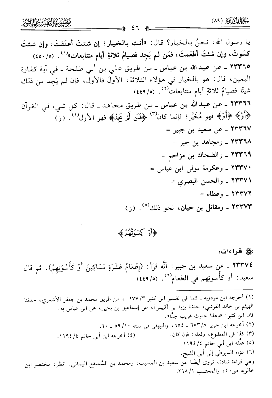 ٢٣٣٧٤ - عن سعيد بن جبير أنّه قرَأ: (إطْعامُ عَشَرَةِ مَساكِينَ أوْ كَأُسْوَتِهِمْ). ثم قال سعيد: أو كأُسوتِهم في الطعام (¬٦). (٥/ ٤٤٩)