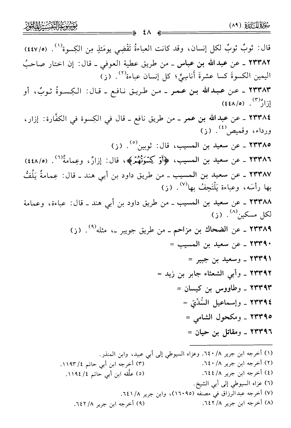 ٢٣٣٨٣ - عن عبد الله بن عمر -من طريق نافع- قال: الكِسوةُ ثوبٌ، أو إزارٌ (¬٣). (٥/ ٤٤٨)