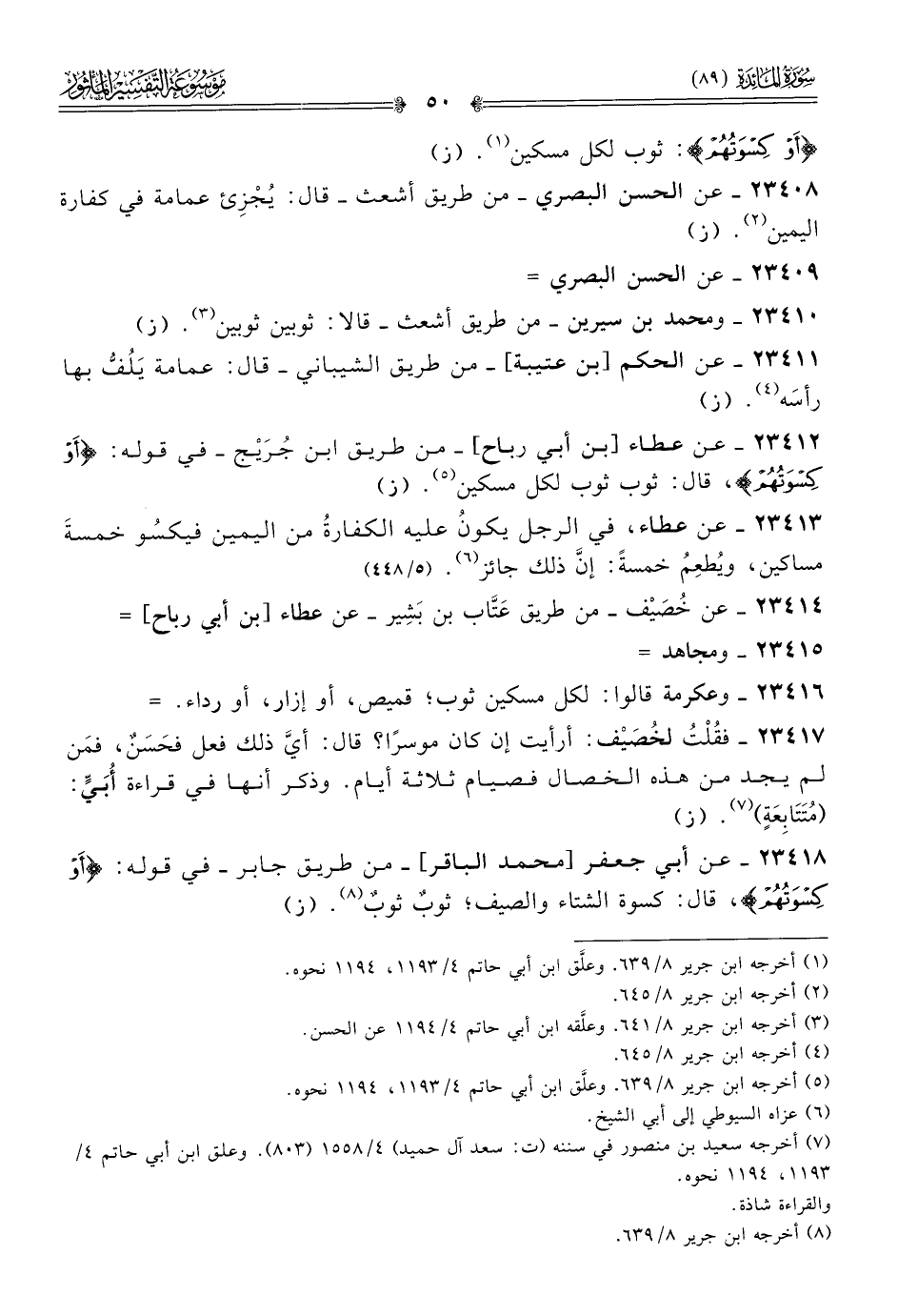 ٢٣٤١٨ - عن أبي جعفر [محمد الباقر]-من طريق جابر- في قوله: {أو كسوتهم}، قال: كسوة الشتاء والصيف؛ ثوبٌ ثوبٌ (¬٨). (ز)