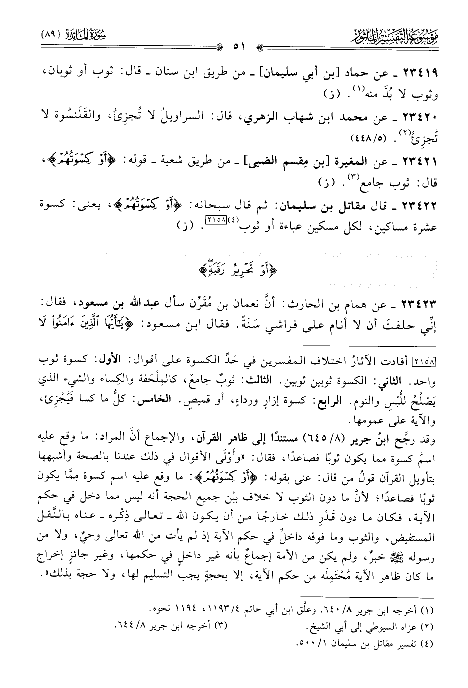٢٣٤٢١ - عن المغيرة [بن مِقسم الضبى]-من طريق شعبة- قوله: {أو كسوتهم}، قال: ثوب جامع (¬٣). (ز)