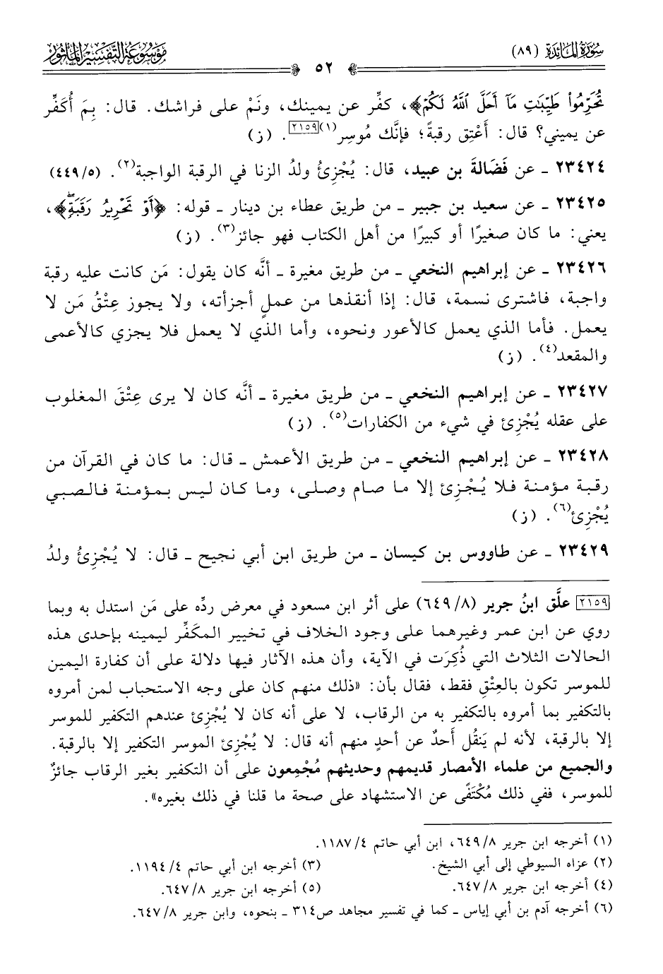 [٢١٥٩] علَّق ابنُ جرير (٨/ ٦٤٩) على أثر ابن مسعود في معرض ردِّه على مَن استدل به وبما روي عن ابن عمر وغيرهما على وجود الخلاف في تخيير المكَفِّر ليمينه بإحدى هذه الحالات الثلاث التي ذُكِرَت في الآية، وأن هذه الآثار فيها دلالة على أن كفارة اليمين للموسر تكون بالعِتْقِ فقط، فقال بأن: «ذلك منهم كان على وجه الاستحباب لمن أمروه بالتكفير بما أمروه بالتكفير به من الرقاب، لا على أنه كان لا يُجْزِئ عندهم التكفير للموسر إلا بالرقبة، لأنه لم يَنقُل أحدٌ عن أحدٍ منهم أنه قال: لا يُجْزِئ الموسر التكفير إلا بالرقبة. والجميع من علماء الأمصار قديمهم وحديثهم مُجْمِعون على أن التكفير بغير الرقاب جائزٌ للموسر، ففي ذلك مُكْتَفًى عن الاستشهاد على صحة ما قلنا في ذلك بغيره».