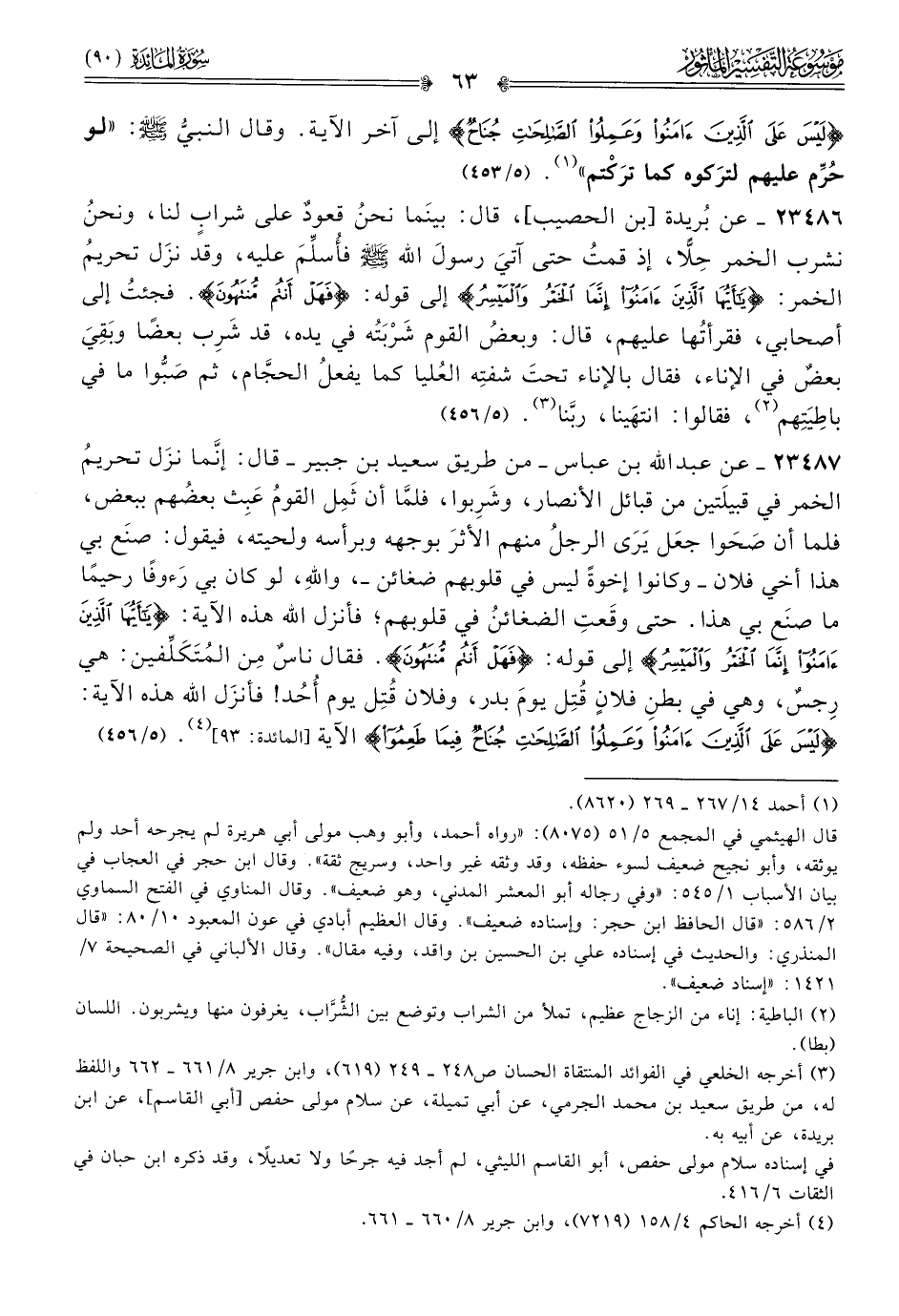 ٢٣٤٨٧ - عن عبد الله بن عباس -من طريق سعيد بن جبير- قال: إنّما نزَل تحريمُ الخمر في قبيلَتين من قبائل الأنصار، وشَرِبوا، فلمّا أن ثَمِل القومُ عَبِث بعضُهم ببعض، فلما أن صَحَوا جعَل يَرى الرجلُ منهم الأثرَ بوجهه وبرأسه ولحيته، فيقول: صنَع بي هذا أخي فلان -وكانوا إخوةً ليس في قلوبهم ضغائن-، واللهِ، لو كان بي رَءوفًا رحيمًا ما صنَع بي هذا. حتى وقَعتِ الضغائنُ في قلوبهم؛ فأنزل الله هذه الآية: {يا أيها الذين آمنوا إنما الخمر والميسر} إلى قوله: {فهل أنتم منتهون}. فقال ناسٌ مِن المُتَكَلِّفين: هي رِجسٌ، وهي في بطنِ فلانٍ قُتِل يومَ بدر، وفلان قُتِل يوم أُحُد! فأنزَل الله هذه الآية: {ليس على الذين آمنوا وعملوا الصالحات جناح فيما طعموا} الآية (¬٤). (٥/ ٤٥٦)