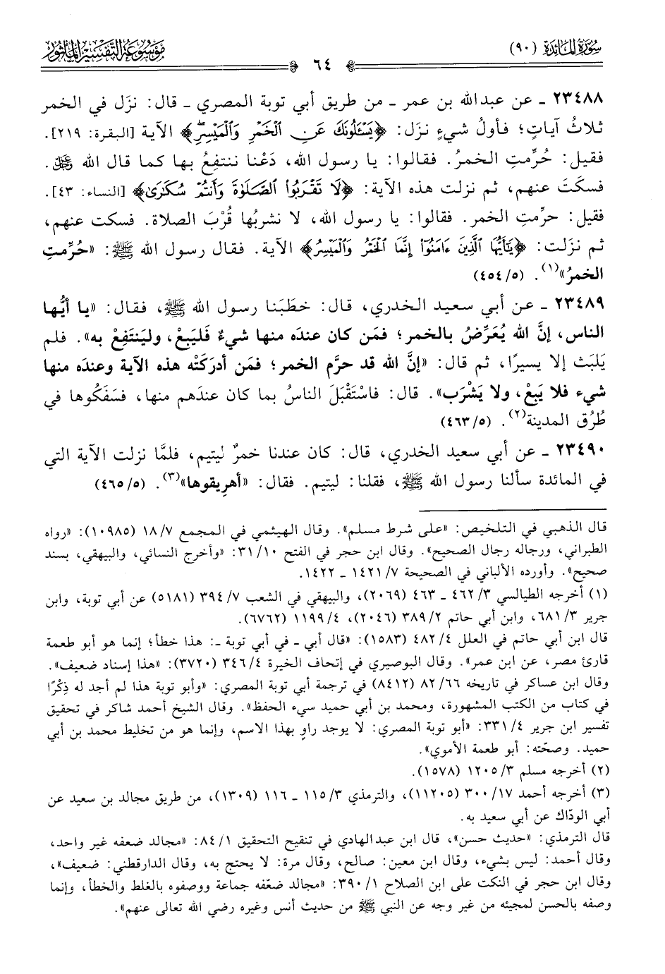 ٢٣٤٨٨ - عن عبد الله بن عمر -من طريق أبي توبة المصري- قال: نزَل في الخمر ثلاثُ آياتٍ؛ فأولُ شيءٍ نزَل: {يسألونك عن الخمر والميسر} الآية. فقيل: حُرِّمتِ الخمرُ. فقالوا: يا رسول الله، دَعْنا ننتفِعُ بها كما قال الله - عز وجل -. فسكَتَ عنهم، ثم نزلت هذه الآية: {لا تقربوا الصلاة وأنتم سكارى}. فقيل: حرِّمتِ الخمر. فقالوا: يا رسول الله، لا نشربُها قُرْبَ الصلاة. فسكت عنهم، ثم نزَلت: {يا أيها الذين آمنوا إنما الخمر والميسر} الآية. فقال رسول الله - صلى الله عليه وسلم -: «حُرِّمتِ الخمرُ» (¬١). (٥/ ٤٥٤)