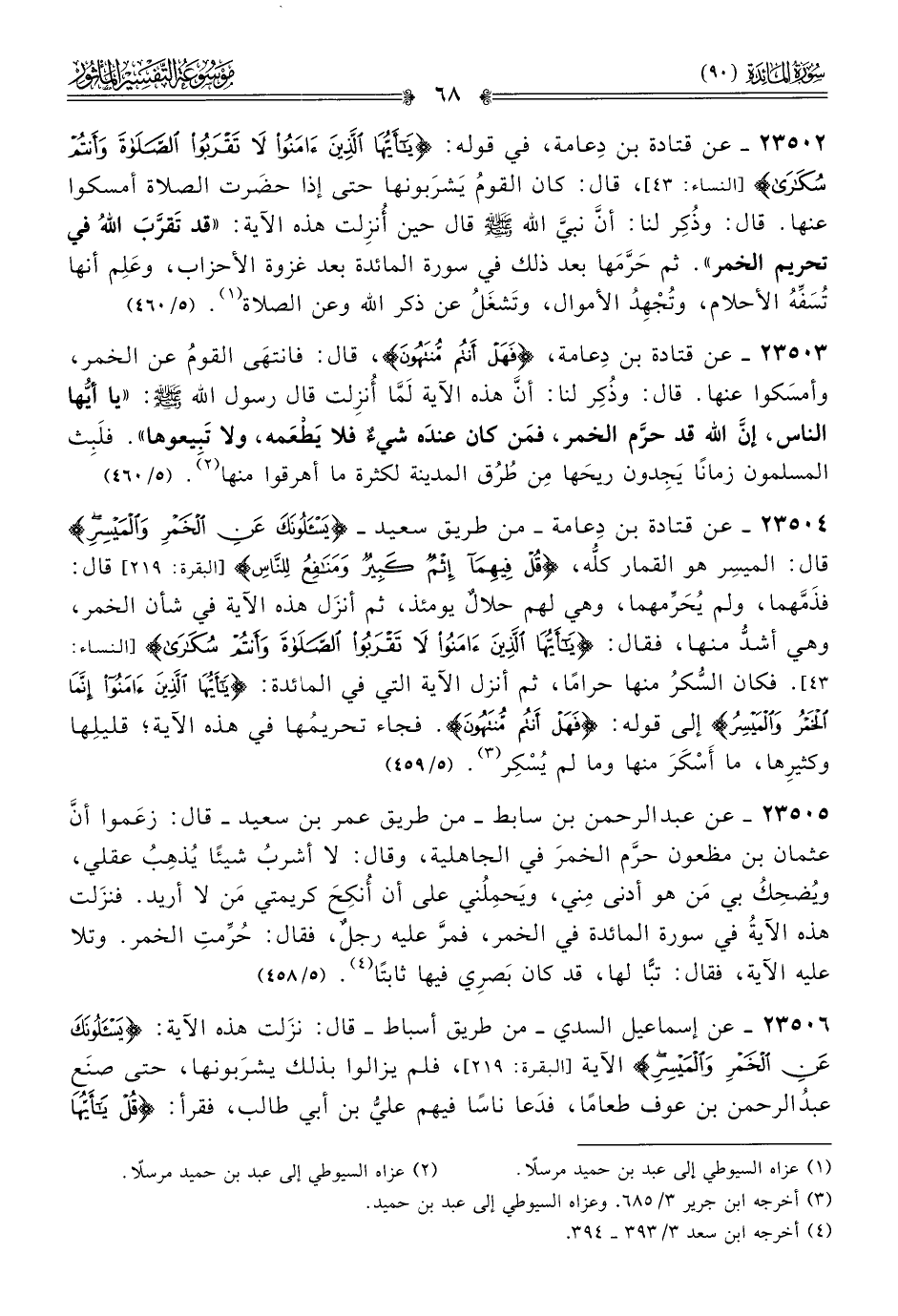 ٢٣٥٠٤ - عن قتادة بن دِعامة -من طريق سعيد- {يسألونك عن الخمر والميسر} قال: الميسِر هو القمار كلُّه، {قل فيهما إثم كبير ومنافع للناس} قال: فذَمَّهما، ولم يُحَرِّمهما، وهي لهم حلالٌ يومئذ، ثم أنزَل هذه الآية في شأن الخمر، وهي أشدُّ منها، فقال: {يا أيها الذين آمنوا لا تقربوا الصلاة وأنتم سكارى}. فكان السُّكرُ منها حرامًا، ثم أنزل الآية التي في المائدة: {يا أيها الذين آمنوا إنما الخمر والميسر} إلى قوله: {فهل أنتم منتهون}. فجاء تحريمُها في هذه الآية؛ قليلِها وكثيرِها، ما أسْكَرَ منها وما لم يُسْكِر (¬٣). (٥/ ٤٥٩)