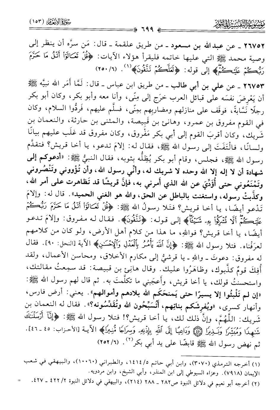 ٢٦٧٥٣ - عن علي بن أبي طالب -من طريق ابن عباس- قال: لَمّا أمَر الله نبيه - صلى الله عليه وسلم - أن يَعْرِضَ نفسَه على قبائل العرب خرَج إلى مِنًى، وأنا معه وأبو بكر، وكان أبو بكر رجلًا نَسّابةً، فوقَف على منازلهم ومضاربِهم بمِنًى، فسلَّم عليهم، فَردُّوا السلام، وكان في القوم مفروق بن عمرو، وهانئ بن قَبِيصة، والمثنى بن حارثة، والنعمان بن شَريك، وكان أقربَ القوم إلى أبي بكر مَفْروق، وكان مفروق قد غلَب عليهم بيانًا ولسانًا، فالتَفَتَ إلى رسول الله - صلى الله عليه وسلم -، فقال له: إلامَ تدعو، يا أخا قريش؟ فتقدَّم رسول الله - صلى الله عليه وسلم -، فجلس، وقام أبو بكر يُظِلُّه بثوبه، فقال النبي - صلى الله عليه وسلم -: «أدعوكم إلى شهادة أن لا إله إلا الله وحده لا شريك له، وأنِّي رسول الله، وأن تُؤْووني وتَنْصُروني وتَمْنَعُوني حتى أُؤَدِّيَ عن الله الذي أمرني به، فإنّ قريشًا قد تَظاهرت على أمر الله، وكذَّبتْ رسوله، واستغنت بالباطل عن الحق، والله هو الغني الحميد». قال له: وإلامَ تَدْعو أيضًا، يا أخا قريش؟ فتَلا رسول الله - صلى الله عليه وسلم -: {قل تعالوا أتل ما حرم ربكم عليكم ألا تشركوا به شيئا} إلى قوله: {تتقون}. فقال له مفروق: وإلامَ تدعو أيضًا، يا أخا قريش؟ فواللهِ، ما هذا من كلام أهل الأرض، ولو كان من كلامهم لعرَفْناه. فتلا رسول الله - صلى الله عليه وسلم -: {إن الله يأمر بالعدل والإحسان} الآية [النحل: ٩٠]. فقال له مفروق: دعوتَ -واللهِ- يا قرشيُّ إلى مكارم الأخلاق، ومحاسن الأعمال، ولقد أُفِكَ قومٌ كذَّبوك، وظاهَرُوا عليك. وقال هانِئ بن قبيصة: قد سمِعتُ مقالتك، واستحسنتُ قولك، يا أخا قريش، وأَعجَبني ما تكلَّمتَ به. ثم قال لهم رسول الله - صلى الله عليه وسلم -: «إن لم تَلْبثُوا إلا يسيرًا حتى يَمنحَكَم الله بلادهم وأموالهم». يعني: أرض فارس، وأنهار كسرى، «ويُفرِشَكم بناتِهم، أتُسَبِّحُون الله وتُقَدِّسُونه؟». فقال له النعمان بن شَريك: اللهم، وإنّ ذلك لك، يا أخا قريش؟! فتلا رسول الله - صلى الله عليه وسلم -: {إنا أرسلناك شاهدا ومبشرا ونذيرا * وداعيا إلى الله بإذنه وسراجا منيرا} الآية [الأحزاب: ٤٥ - ٤٦]. ثم نهض رسول الله - صلى الله عليه وسلم - قابضًا على يد أبي بكر (¬٢). (٦/ ٢٥٢)