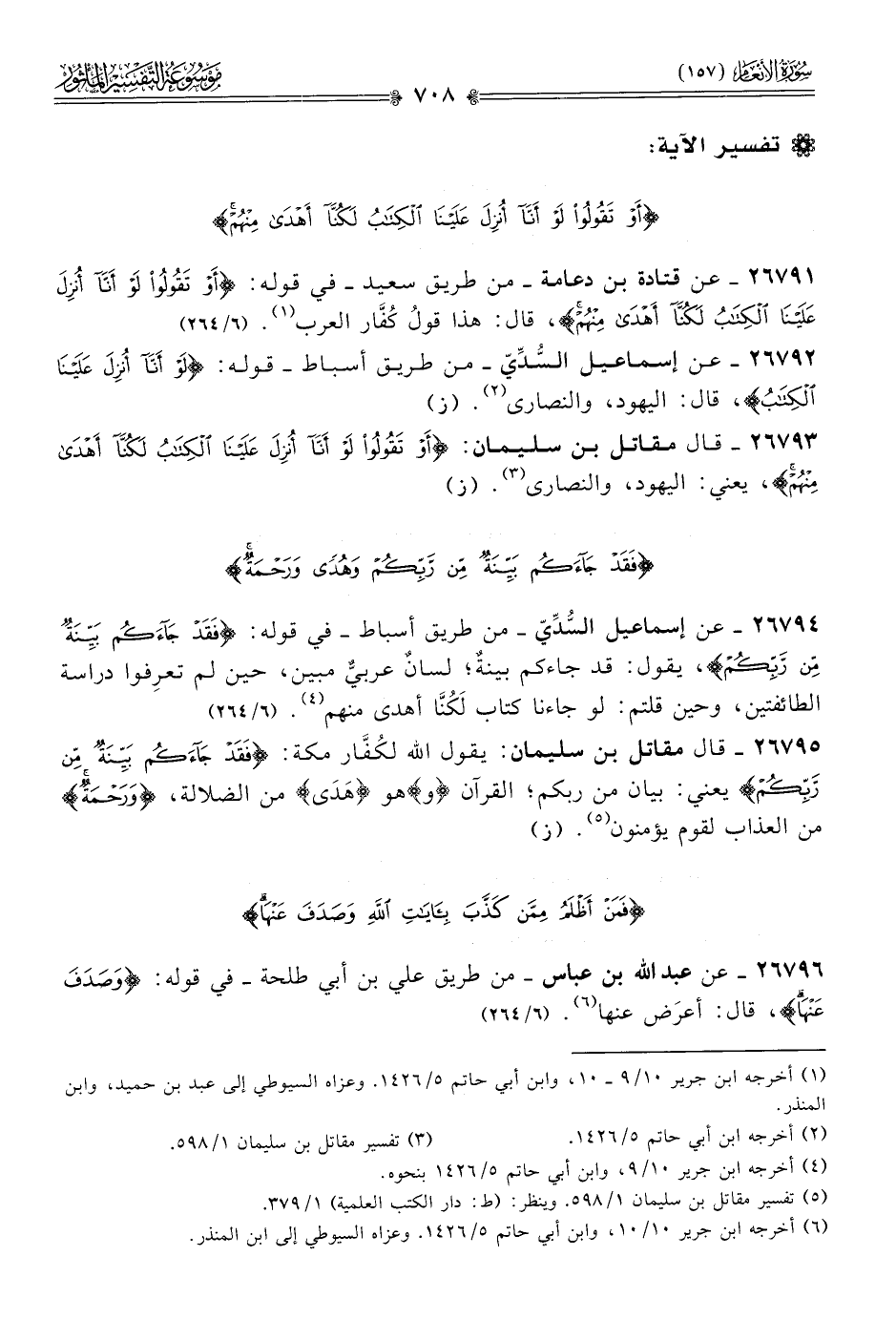 ٢٦٧٩٣ - قال مقاتل بن سليمان: {أو تقولوا لو أنا أنزل علينا الكتاب لكنا أهدى منهم}، يعني: اليهود، والنصارى (¬٣). (ز)