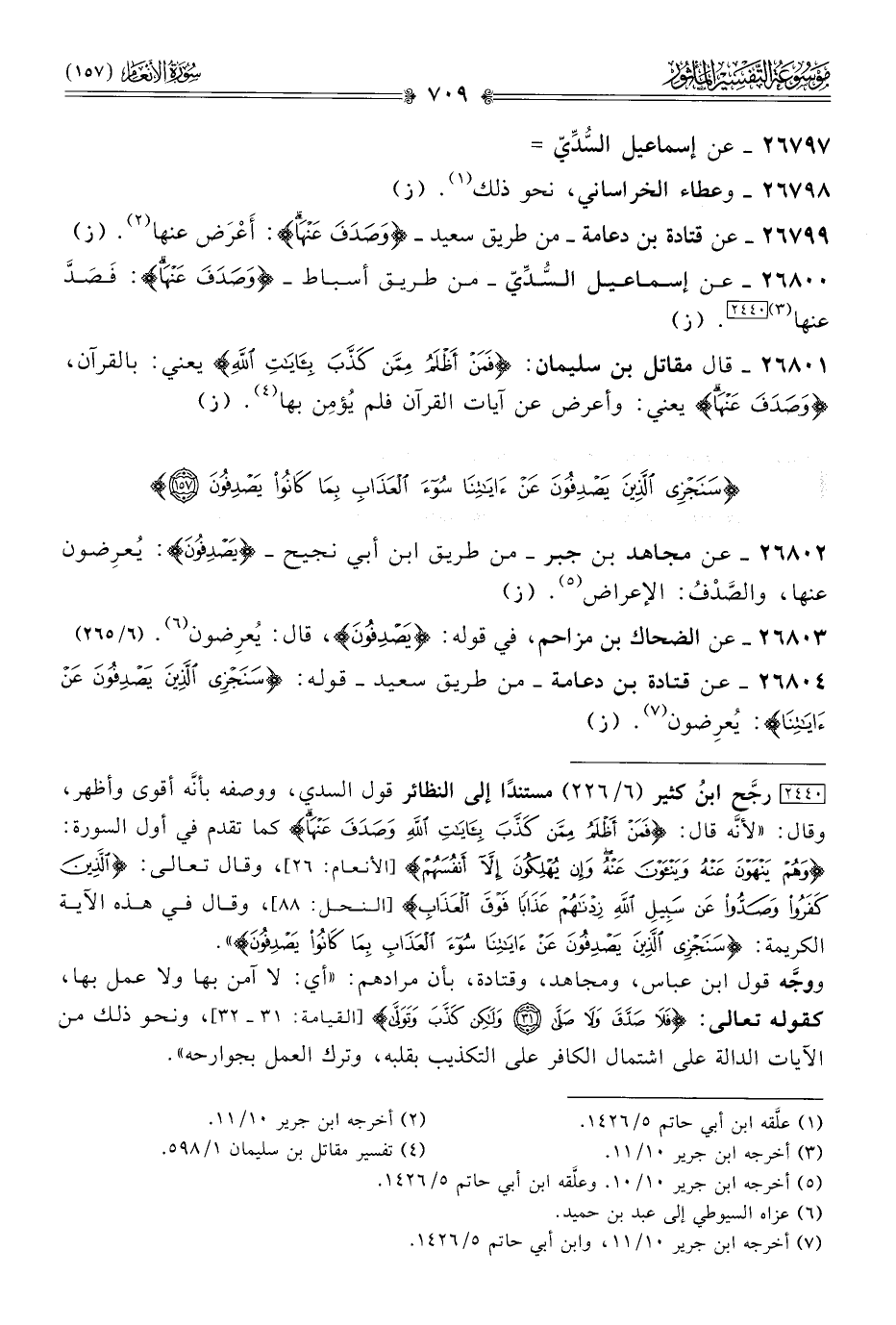 [٢٤٤٠] رجَّح ابنُ كثير (٦/ ٢٢٦) مستندًا إلى النظائر قول السدي، ووصفه بأنّه أقوى وأظهر، وقال: «لأنّه قال: {فَمَن أظْلَمُ مِمَّنْ كَذَّبَ بِآياتِ اللَّهِ وصَدَفَ عَنْها} كما تقدم في أول السورة: {وهُمْ يَنْهَوْنَ عَنْهُ ويَنْأَوْنَ عَنْهُ وإنْ يُهْلِكُونَ إلا أنْفُسَهُمْ} [الأنعام: ٢٦]، وقال تعالى: {الَّذِينَ كَفَرُوا وصَدُّوا عَنْ سَبِيلِ اللَّهِ زِدْناهُمْ عَذابًا فَوْقَ العَذابِ} [النحل: ٨٨]، وقال في هذه الآية الكريمة: {سَنَجْزِي الَّذِينَ يَصْدِفُونَ عَنْ آياتِنا سُوءَ العَذابِ بِما كانُوا يَصْدِفُونَ}».