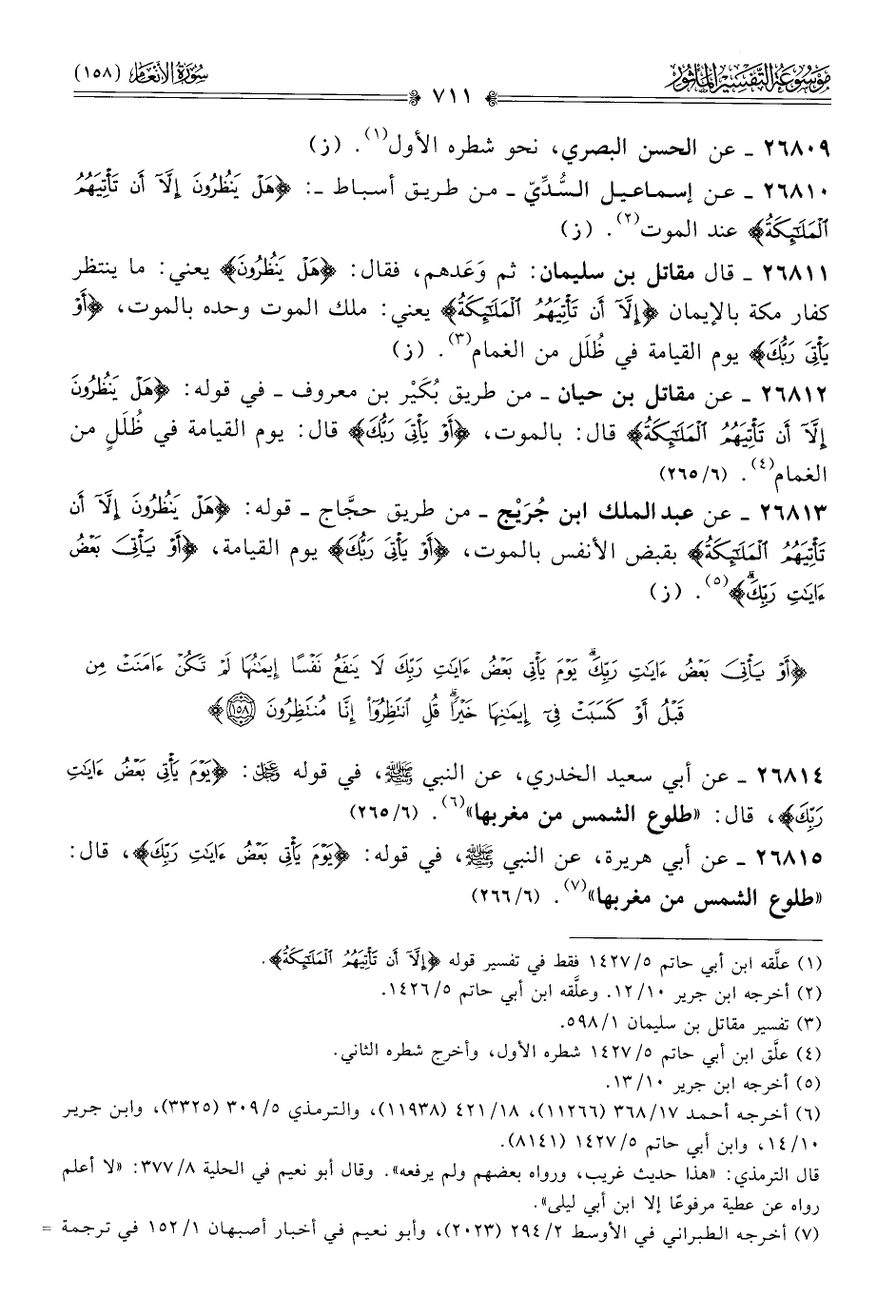 ٢٦٨١٥ - عن أبي هريرة، عن النبي - صلى الله عليه وسلم -، في قوله: {يوم يأتي بعض آيات ربك}، قال: «طلوع الشمس من مغربها» (¬٧). (٦/ ٢٦٦)