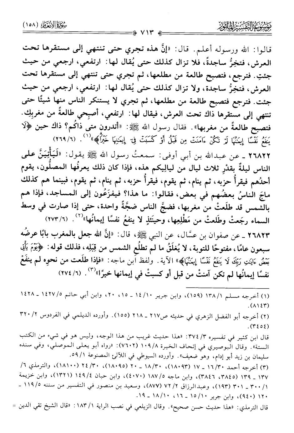 قالوا: الله ورسوله أعلم. قال: «إنّ هذه تجري حتى تنتهي إلى مستقرها تحت العرش، فتخِرُّ ساجدةً، فلا تزال كذلك حتى يُقال لها: ارتفعي، ارجعي من حيث جئتِ. فترجع، فتصبح طالعة من مطلعها، ثم تجري حتى تنتهي إلى مستقرها تحت العرش، فتخِرُّ ساجدة، ولا تزال كذلك حتى يُقال لها: ارتفعي، ارجعي من حيث جئت. فترجع فتصبح طالعة من مطلعها، ثم تجري لا يستنكر الناس منها شيئًا حتى تنتهي إلى مستقرها ذاك تحت العرش، فيقال لها: ارتفعي، أصبِحي طالعةً من مغربِكِ. فتصبح طالعةً من مغربها». فقال رسول الله - صلى الله عليه وسلم -: «أتدرون متى ذاكُم؟ ذاك حين {لا ينفع نفسا إيمانها لم تكن آمنت من قبل أو كسبت في إيمانها خيرا}» (¬١). (٦/ ٢٦٩)