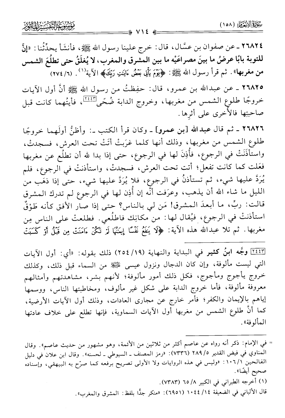 ٢٦٨٢٦ - ثم قال عبد الله [بن عمرو]-وكان قرأ الكتب-: وأظنُّ أولَهما خروجًا طلوع الشمس من مغربها، وذلك أنها كلما غرَبتْ أتَتْ تحت العرش، فسجدتْ، واستأذَنَتْ في الرجوع، فأُذِنَ لها في الرجوع، حتى إذا بدا لله أن تطلُع عن مغربها فعَلت كما كانت تفعل؛ أتت تحت العرش، فسجدتْ، واستأذنتْ في الرجوع، فلم يُرَدَّ عليها شيء، ثم تستأذنُ في الرجوع، فلا يُرَدَّ عليها شيء، حتى إذا ذهَب من الليل ما شاء الله أن يذهب، وعرَفت أنّه إن أُذِن لها في الرجوع لم تدرك المشرق قالت: ربِّ، ما أبعدَ المشرق! مَن لي بالناس؟ حتى إذا صار الأفق كأنه طَوْقٌ استأذنتْ في الرجوع، فيُقال لها: من مكانِك فاطلُعي. فطلعتْ على الناس مِن مغربها. ثم تلا عبد الله هذه الآية: {لا ينفع نفسا إيمانها لم تكن آمنت من قبل أو كسبت