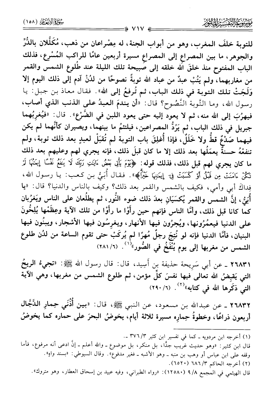 للتوبة خلفَ المغرب، وهو من أبواب الجنة، له مِصْراعان من ذهب، مُكَلَّلان بالدُّرِّ والجوهر، ما بين المصراعِ إلى المصراعِ مسيرة أربعين عامًا للراكب المُسْرِع، فذلك الباب المفتوح منذ خلقَ الله خلقه إلى صبيحة تلك الليلة عند طُلوع الشمس والقمر من مغاربهما، ولم يَتُبْ عبدٌ من عباد الله توبةً نصوحًا من لدُنْ آدم إلى ذلك اليوم إلا ولَجَتْ تلك التوبة في ذلك الباب، ثم تُرفعُ إلى الله». فقال معاذ بن جبل: يا رسول الله، وما التَّوبة النَّصُوح؟ قال: «أن يندمَ العبدُ على الذنب الذي أصاب، فيهرُبَ إلى الله منه، ثم لا يعود إليه حتى يعود اللبن في الضَّرْع». قال: «فيُغرِبُهما جبريل في ذلك الباب، ثم يَرُدُّ المصراعين، فيلتئمُ ما بينهما، ويصيران كأنّهما لم يكن فيهما صَدْعٌ قطُّ ولا خَلَلٌ، فإذا أُغلِقَ باب التوبة لم تُقبَلْ لعبدٍ بعد ذلك توبة، ولم تنفعْهُ حسنةٌ يعمَلُها بعد ذلك إلا ما كان قبلَ ذلك، فإنه يجري لهم وعليهم بعد ذلك ما كان يجري لهم قبل ذلك، فذلك قوله: {يوم يأتي بعض آيات ربك لا ينفع نفسا إيمانها لم تكن آمنت من قبل أو كسبت في إيمانها خيرا}». فقال أُبَيُّ بن كعب: يا رسول الله، فِداكَ أبي وأمي، فكيف بالشمس والقمر بعد ذلك؟ وكيف بالناس والدنيا؟ قال: «يا أُبَيُّ، إنّ الشمس والقمر يُكسَيانِ بعدَ ذلك ضوء النُّور، ثم يطلُعان على الناس ويَغرُبان كما كانا قبل ذلك، وأمّا الناس فإنهم حين رأَوْا ما رأَوْا من تلك الآية وعِظَمْها يُلِحُّونَ على الدنيا فيعمُرُونها، ويُجرُون فيها الأنهار، ويغرِسُون فيها الأشجار، ويبنُون فيها البنيان، فأمّا الدنيا فإنه لو نُتِجَ رجلٌ مُهرًا لم يُركَبْ حتى تقوم الساعة من لدُن طلوع الشمس من مغربها إلى يوم يُنْفَخُ في الصُّور» (¬١). (٦/ ٢٨١)