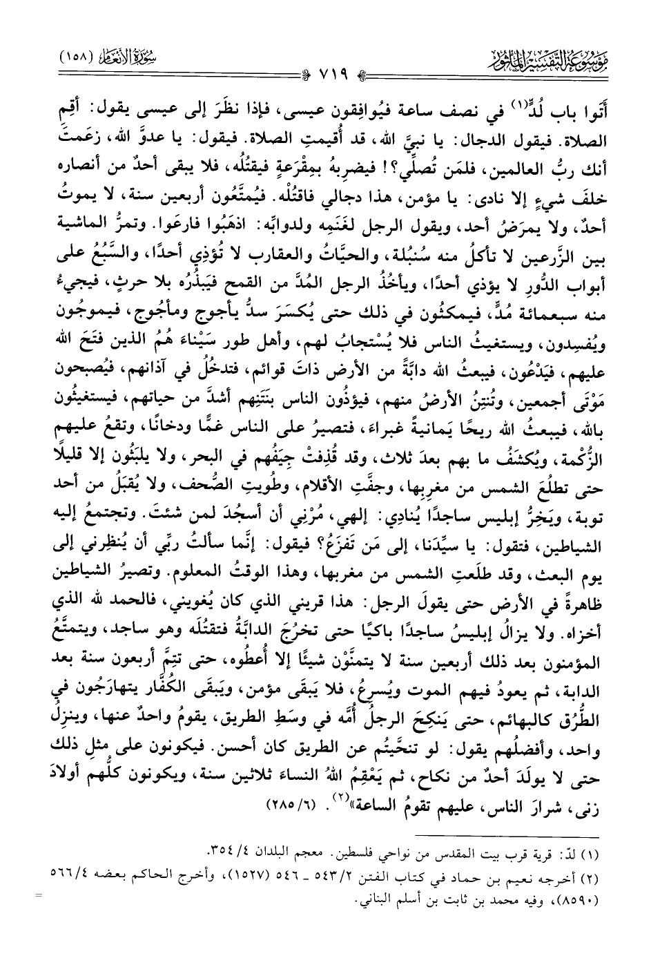 أتَوا باب لُدٍّ (¬١) في نصف ساعة فيُوافِقون عيسى، فإذا نظَرَ إلى عيسى يقول: أقِمِ الصلاة. فيقول الدجال: يا نبي الله، قد أُقيمتِ الصلاة. فيقول: يا عدوَّ الله، زعَمتَ أنك ربُّ العالمين، فلمَن تُصلِّي؟! فيضرِبهُ بمِقْرَعةٍ فيقتُلُه، فلا يبقى أحدٌ من أنصاره خلفَ شيءٍ إلا نادى: يا مؤمن، هذا دجالي فاقتُلْه. فيُمتَّعُون أربعين سنة، لا يموتُ أحدٌ، ولا يمرَضُ أحد، ويقول الرجل لغَنَمِه ولدوابِّه: اذهَبُوا فارعَوا. وتمرُّ الماشية بين الزَّرعين لا تأكلُ منه سُنبُلة، والحيّاتُ والعقارب لا تُؤذِي أحدًا، والسَّبُعُ على أبواب الدُّورِ لا يؤذي أحدًا، ويأخُذُ الرجل المُدَّ من القمح فيَبذُرُه بلا حرثٍ، فيجيءُ منه سبعمائة مُدٍّ، فيمكثُون في ذلك حتى يُكسَرَ سدُّ يأجوج ومأجُوج، فيموجُون ويُفسِدون، ويستغيثُ الناس فلا يُسْتجابُ لهم، وأهل طور سَيْناءَ هُمُ الذين فتَحَ الله عليهم، فيَدْعُون، فيبعثُ الله دابَّةً من الأرض ذاتَ قوائم، فتدخُلُ في آذانهم، فيُصبحون مَوْتى أجمعين، وتُنتِنُ الأرضُ منهم، فيؤذُون الناس بنَتَنِهم أشدَّ من حياتهم، فيستغيثُون بالله، فيبعثُ الله ريحًا يَمانيةً غبراءَ، فتصيرُ على الناس غمًّا ودخانًا، وتقعُ عليهم الزُّكْمة، ويُكشَفُ ما بهم بعدَ ثلاث، وقد قُذِفتْ جِيَفُهم في البحر، ولا يلبَثُون إلا قليلًا حتى تطلُعَ الشمس من مغرِبِها، وجفَّتِ الأقلام، وطُويتِ الصُّحف، ولا يُقبَلُ من أحد توبة، ويَخِرُّ إبليس ساجدًا يُنادِي: إلهي، مُرْنِي أن أسجُدَ لمن شئتَ. وتجتمعُ إليه الشياطين، فتقول: يا سيِّدَنا، إلى مَن تَفزَعُ؟ فيقول: إنّما سألتُ ربِّي أن يُنظِرني إلى يوم البعث، وقد طلَعتِ الشمس من مغربها، وهذا الوقتُ المعلوم. وتصيرُ الشياطين ظاهرةً في الأرض حتى يقولَ الرجل: هذا قريني الذي كان يُغويني، فالحمد لله الذي أخزاه. ولا يزالُ إبليسُ ساجدًا باكيًا حتى تخرُجَ الدابَّةُ فتقتُلَه وهو ساجد، ويتمتَّعُ المؤمنون بعد ذلك أربعين سنة لا يتمنَّوْن شيئًا إلا أُعطُوه، حتى تتِمَّ أربعون سنة بعد الدابة، ثم يعودُ فيهم الموت ويُسرِعُ، فلا يَبقى مؤمن، ويَبقى الكُفّار يتهارَجُون في الطُّرُق كالبهائم، حتى يَنكِحَ الرجلُ أُمَّه في وسَطِ الطريق، يقومُ واحدٌ عنها، وينزِلُ واحد، وأفضلُهم يقول: لو تنحَّيتُم عن الطريق كان أحسن. فيكونون على مثلِ ذلك حتى لا يولَدَ أحدٌ من نكاح، ثم يَعْقِمُ اللهُ النساءَ ثلاثين سنة، ويكونون كلُّهم أولادَ زنى، شرارَ الناس، عليهم تقومُ الساعة» (¬٢). (٦/ ٢٨٥)