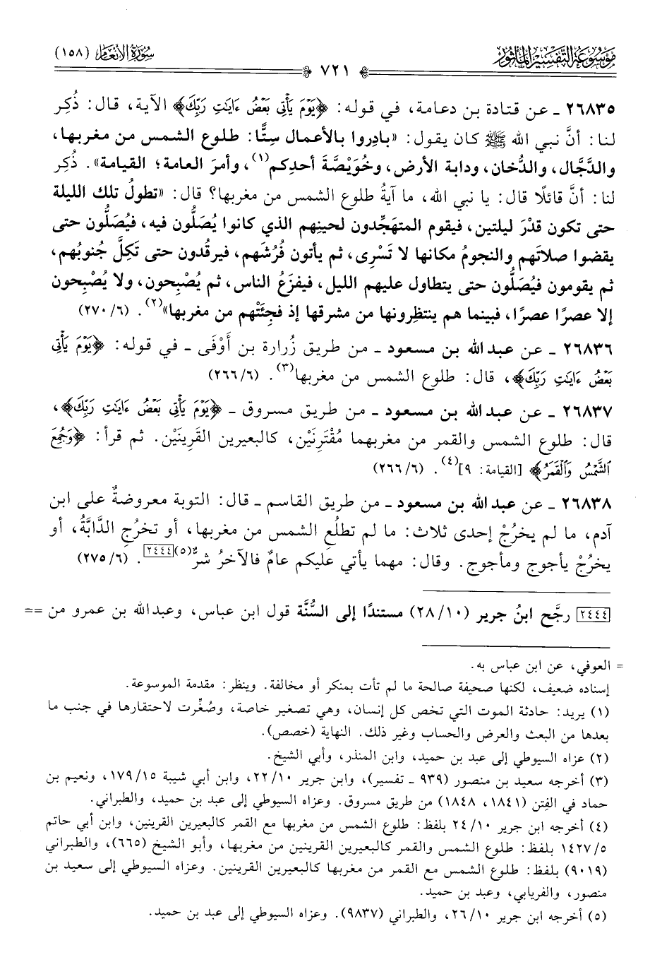 ٢٦٨٣٦ - عن عبد الله بن مسعود -من طريق زُرارة بن أوْفى- في قوله: {يوم يأتي بعض آيات ربك}، قال: طلوع الشمس من مغربها (¬٣). (٦/ ٢٦٦)