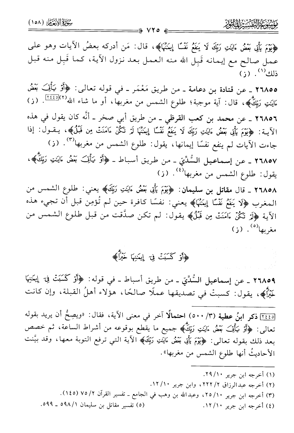 ٢٦٨٥٩ - عن إسماعيل السُّدِّيّ -من طريق أسباط- في قوله: {أو كسبت في إيمانها خيرا}، يقول: كسبتْ في تصديقها عملًا صالحًا، هؤلاء أهلُ القبلة، وإن كانت