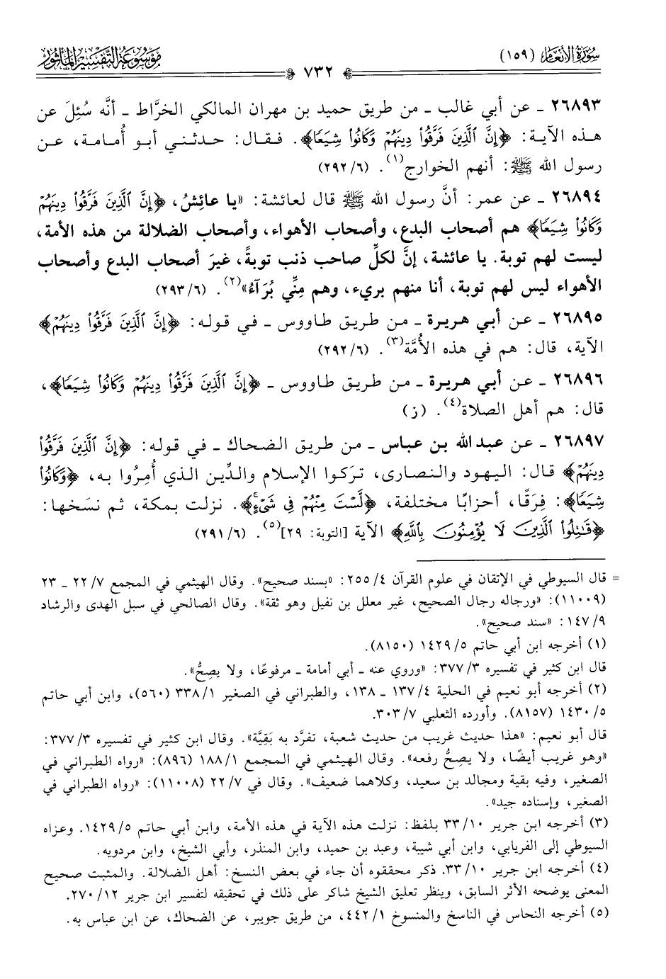 ٢٦٨٩٥ - عن أبي هريرة -من طريق طاووس- في قوله: {إن الذين فرقوا دينهم} الآية، قال: هم في هذه الأُمَّة (¬٣). (٦/ ٢٩٢)