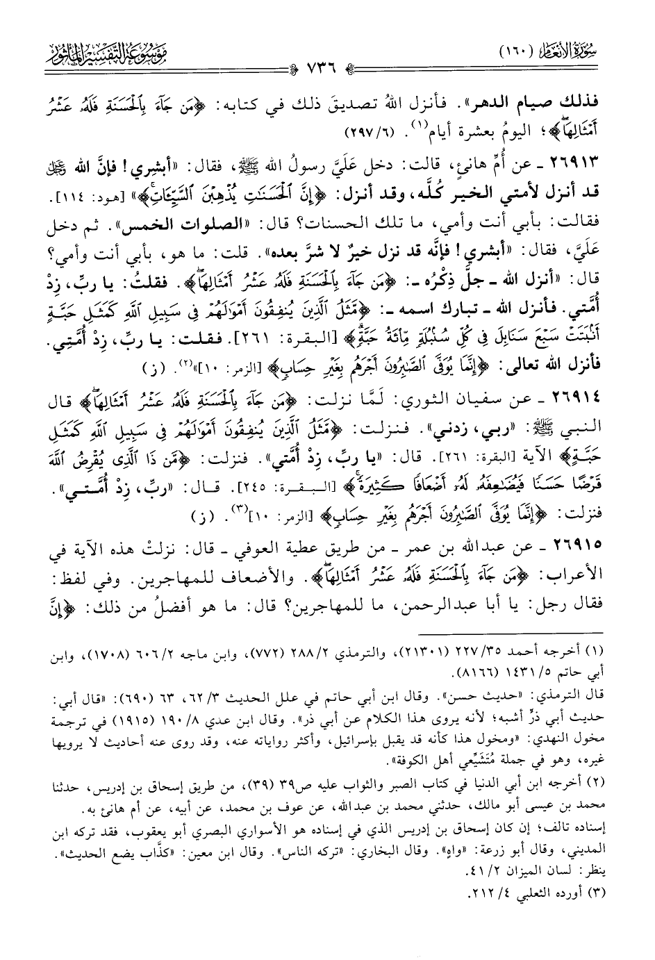 ٢٦٩١٣ - عن أُمِّ هانئٍ، قالت: دخل عَلَيَّ رسول الله - صلى الله عليه وسلم -، فقال: «أبشِري! فإنّ الله - عز وجل - قد أنزل لأمتي الخير كُلَّه، وقد أنزل: {إنَّ الحَسَناتِ يُذْهِبْنَ السَّيِّئاتِ}». [هود: ١١٤] فقالت: بأبي أنت وأمي، ما تلك الحسنات؟ قال: «الصلوات الخمس». ثم دخل عَلَيَّ، فقال: «أبشري! فإنّه قد نزل خيرٌ لا شرَّ بعده». قلت: ما هو، بأبي أنت وأمي؟ قال: «أنزل الله -جلَّ ذِكْرُه-: {مَن جاءَ بِالحَسَنَةِ فَلَهُ عَشْرُ أمْثالِها}. فقلتُ: يا ربِّ، زِدْ أُمَّتي. فأنزل الله -تبارك اسمه-: {مَثَلُ الَّذِينَ يُنْفِقُونَ أمْوالَهُمْ فِي سَبِيلِ اللَّهِ كَمَثَلِ حَبَّةٍ أنْبَتَتْ سَبْعَ سَنابِلَ فِي كُلِّ سُنْبُلَةٍ مِائَةُ حَبَّةٍ} [البقرة: ٢٦١]. فقلت: يا ربِّ، زِدْ أُمَّتِي. فأنزل الله تعالى: {إنَّما يُوَفّى الصّابِرُونَ أجْرَهُمْ بِغَيْرِ حِسابٍ} [الزمر: ١٠]» (¬٢). (ز)