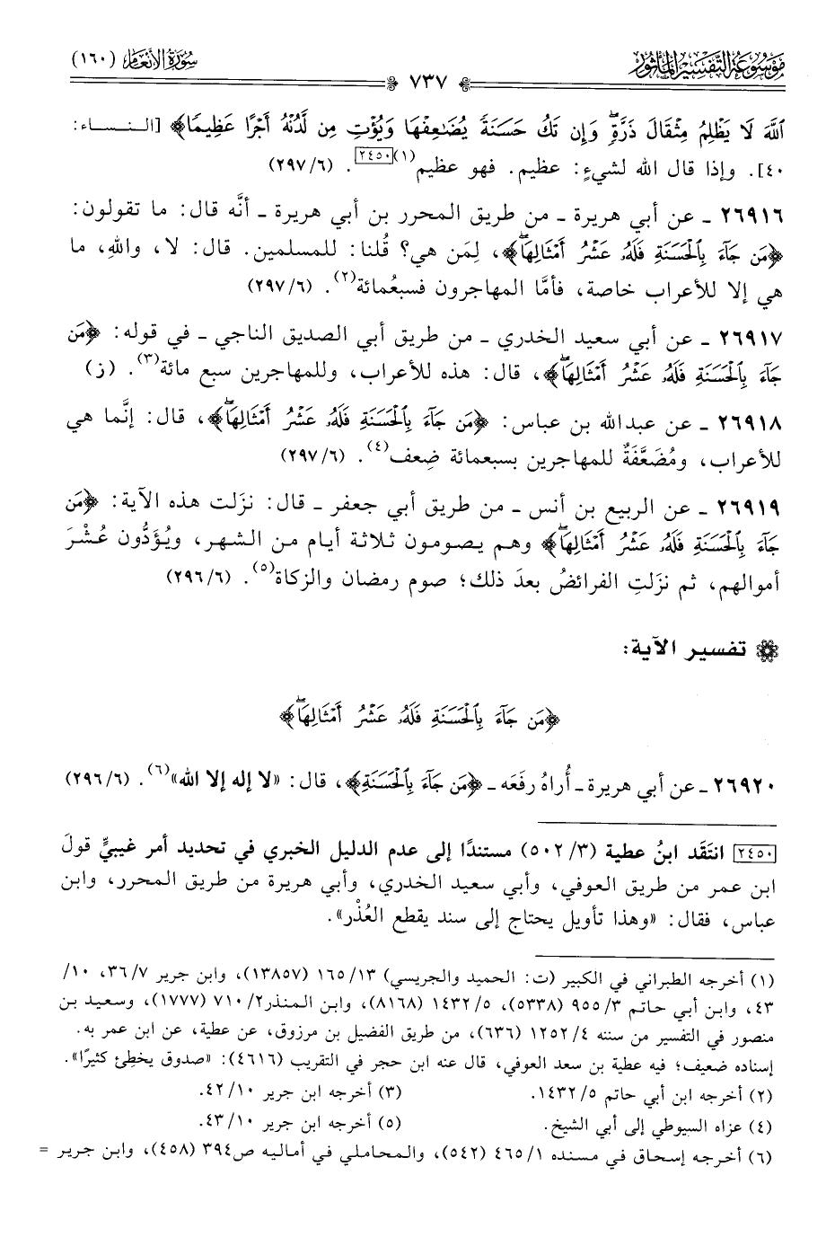 ٢٦٩١٧ - عن أبي سعيد الخدري -من طريق أبي الصديق الناجي- في قوله: {من جاء بالحسنة فله عشر أمثالها}، قال: هذه للأعراب، وللمهاجرين سبع مائة (¬٣). (ز)