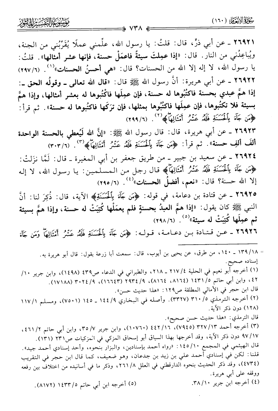 ٢٦٩٢٣ - عن أبي هريرة، قال: قال رسول الله - صلى الله عليه وسلم -: «إنّ الله لَيُعطي بالحسنة الواحدة ألفَ ألفِ حسنة». ثم قرأ: {من جاء بالحسنة فله عشر أمثالها} (¬٣). (٦/ ٣٠٣)