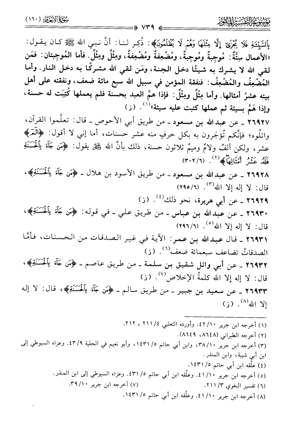٢٦٩٢٨ - عن عبد الله بن مسعود -من طريق الأسود بن هلال- {من جاء بالحسنة}، قال: لا إله إلا الله (¬٣). (٦/ ٢٩٦)
