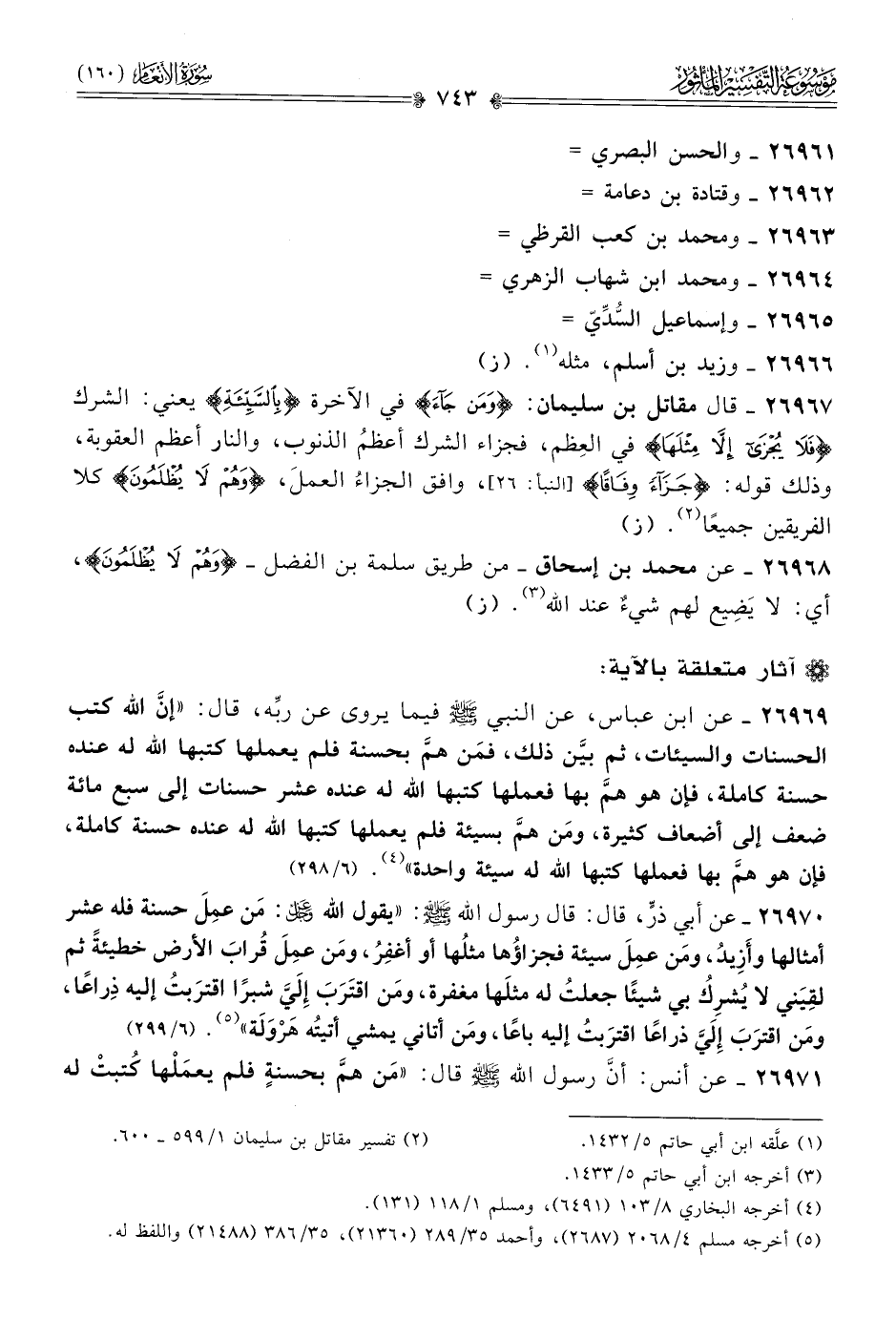 ٢٦٩٦٨ - عن محمد بن إسحاق -من طريق سلمة بن الفضل- {وهم لا يظلمون}، أي: لا يَضِيع لهم شيءٌ عند الله (¬٣). (ز)