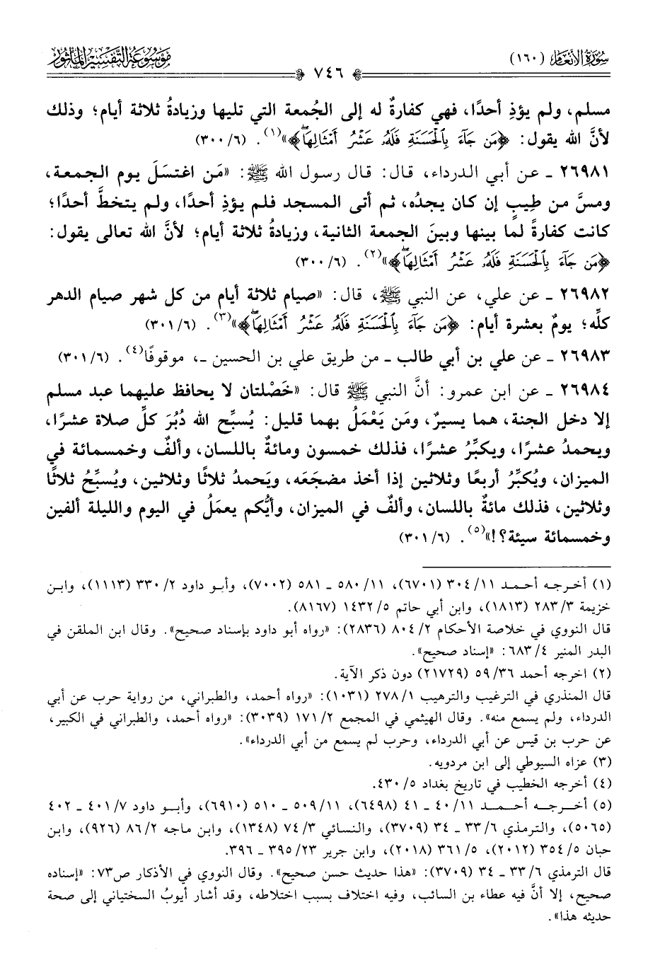 ٢٦٩٨٢ - عن علي، عن النبي - صلى الله عليه وسلم -، قال: «صيام ثلاثة أيام من كل شهر صيام الدهر كلِّه؛ يومٌ بعشرة أيام: {من جاء بالحسنة فله عشر أمثالها}» (¬٣). (٦/ ٣٠١)