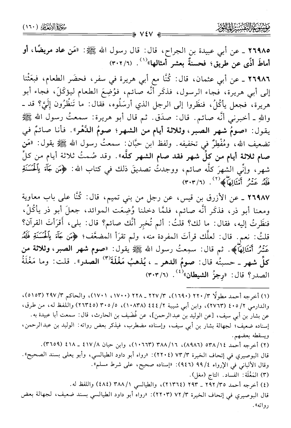٢٦٩٨٦ - عن أبي عثمان، قال: كُنّا مع أبي هريرة في سفر، فحضَر الطعام، فبعَثْنا إلى أبي هريرة، فجاء الرسول، فذكَر أنّه صائم، فوُضِعَ الطعام ليؤكَلَ، فجاء أبو هريرة، فجعل يأكُلُ، فنظَروا إلى الرجل الذي أرسَلُوه، فقال: ما تَنظُرُون إلَيَّ؟ قد -واللهِ- أخبرني أنّه صائم. قال: صدَق. ثم قال أبو هريرة: سمعتُ رسول الله - صلى الله عليه وسلم - يقول: «صومُ شهر الصبر، وثلاثة أيام من الشهر؛ صومُ الدَّهْر». فأنا صائمٌ في تضعيف الله، ومُفْطِرٌ في تخفيفه. ولفظ ابن حبّان: سمعتُ رسول الله - صلى الله عليه وسلم - يقول: «مَن صام ثلاثة أيام من كلِّ شهر فقد صام الشهر كلَّه». وقد صُمتُ ثلاثة أيام من كلِّ شهر، وإنِّي الشهرَ كلَّه صائم، ووجدتُ تصديقَ ذلك في كتاب الله: {من جاء بالحسنة فله عشر أمثالها} (¬٢). (٦/ ٣٠٣)