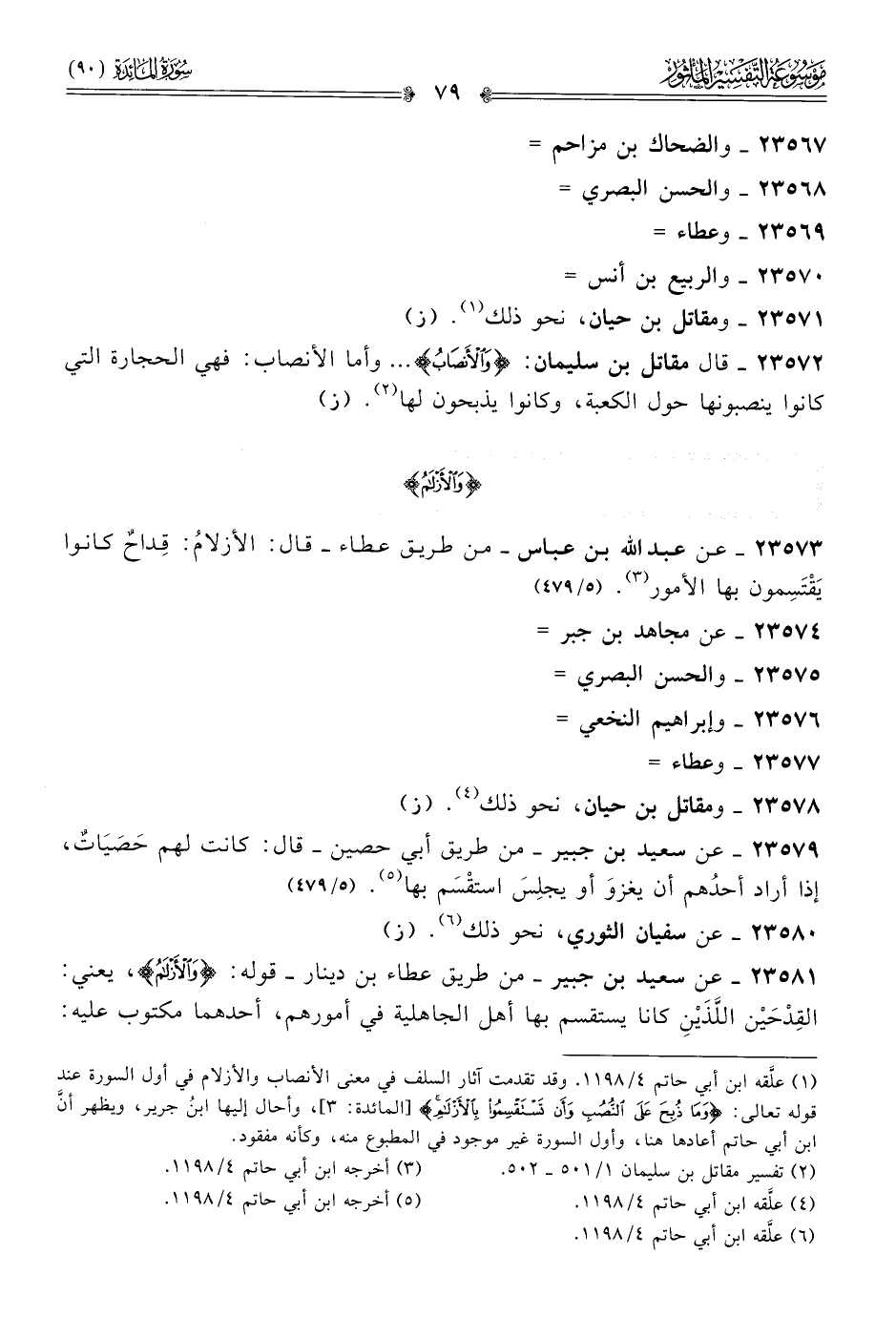 (¬١) علَّقه ابن أبي حاتم ٤/ ١١٩٨. وقد تقدمت آثار السلف في معنى الأنصاب والأزلام في أول السورة عند قوله تعالى: {وما ذُبِحَ عَلى النُّصُبِ وأَنْ تَسْتَقْسِمُوا بِالأَزْلامِ} [المائدة: ٣]، وأحال إليها ابنُ جرير، ويظهر أنّ ابن أبي حاتم أعادها هنا، وأول السورة غير موجود في المطبوع منه، وكأنه مفقود.