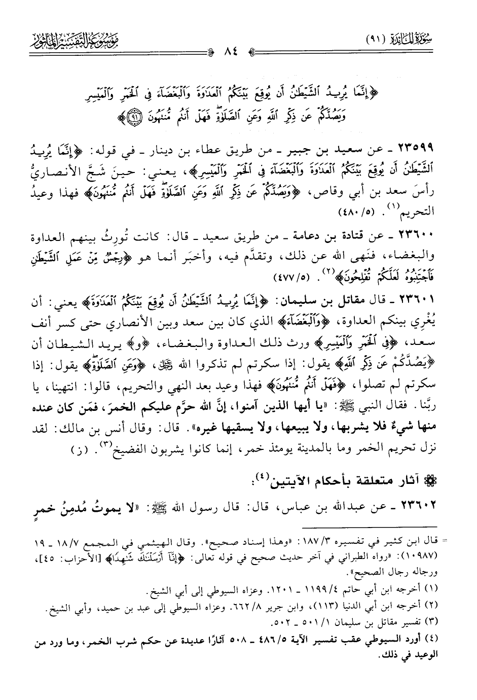 (¬٤) أورد السيوطي عقب تفسير الآية ٥/ ٤٨٦ - ٥٠٨ آثارًا عديدة عن حكم شرب الخمر، وما ورد من